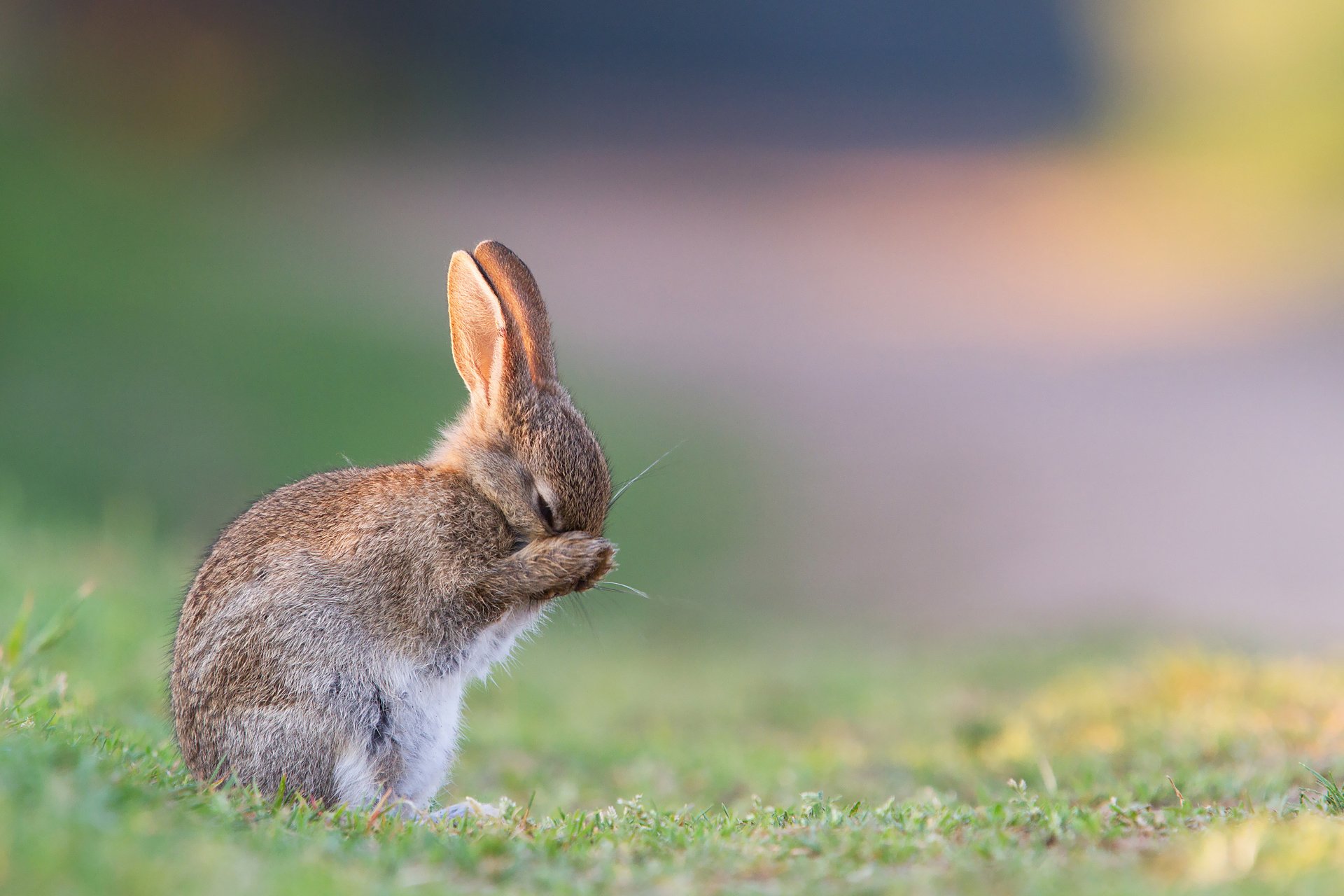 Ein kleiner grauer Hase sitzt auf dem Boden
