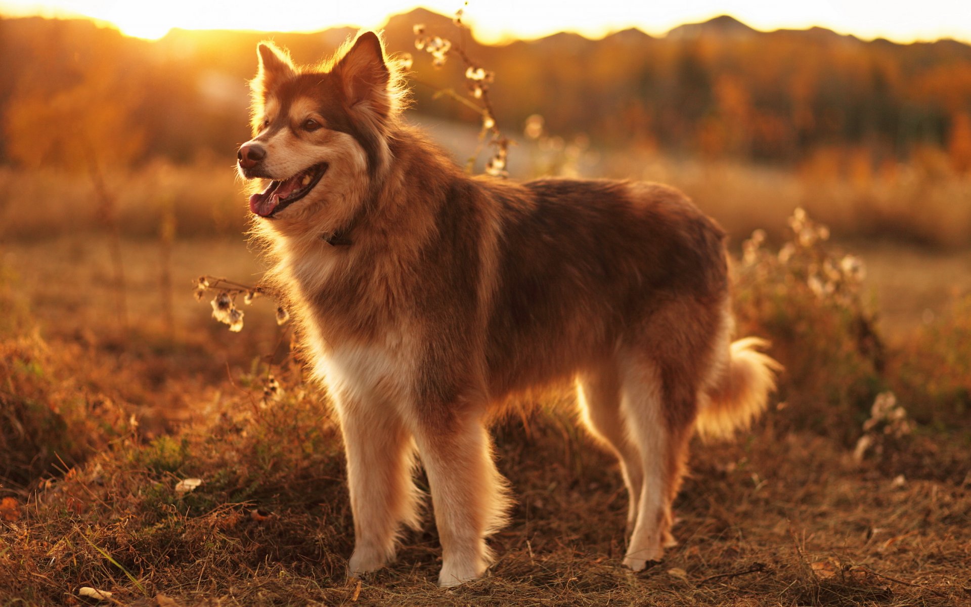 Der Hund schaut vom Gipfel des Berges in die Ferne