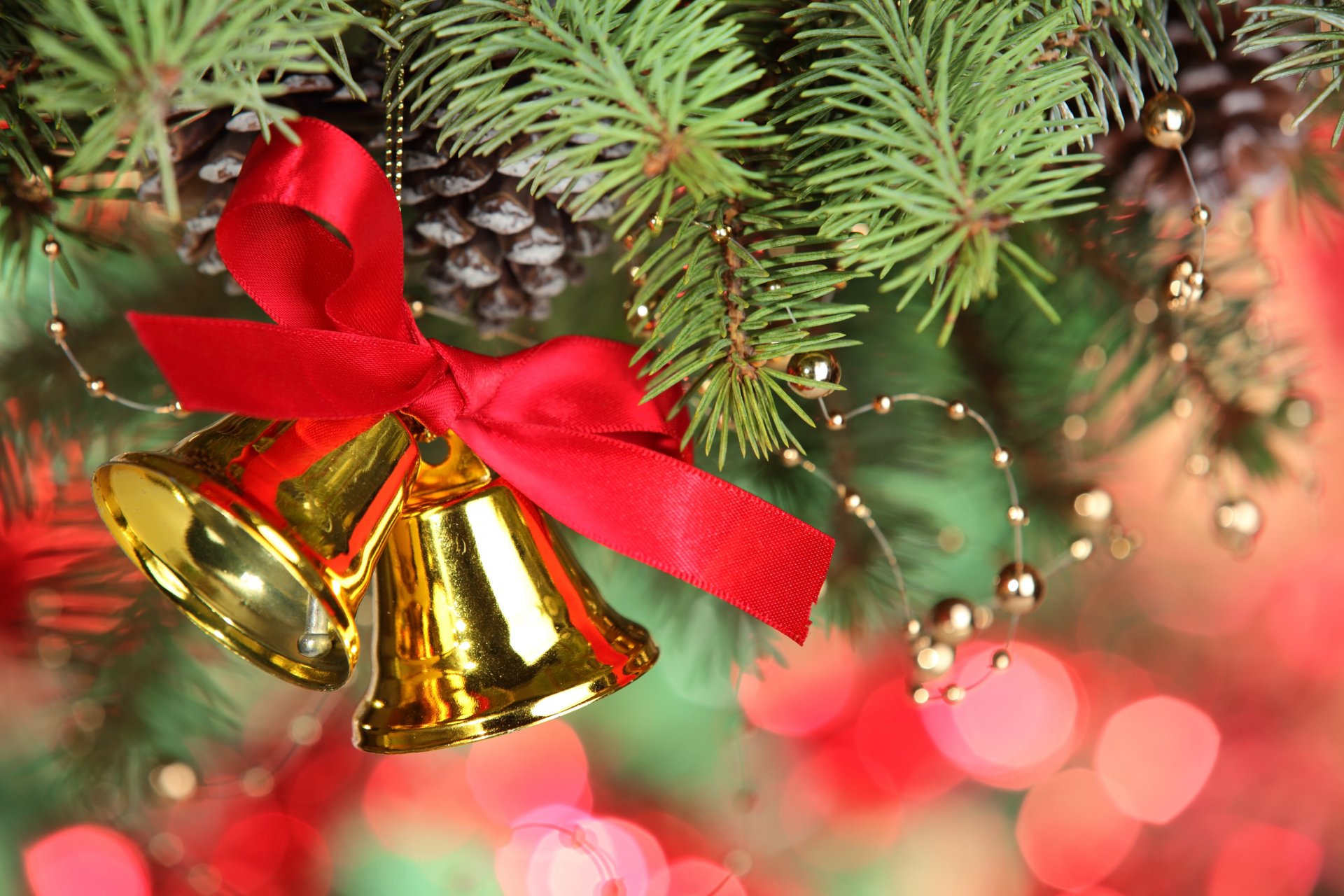Dekoration von goldenen Glocken mit roter Schleife am Weihnachtsbaum