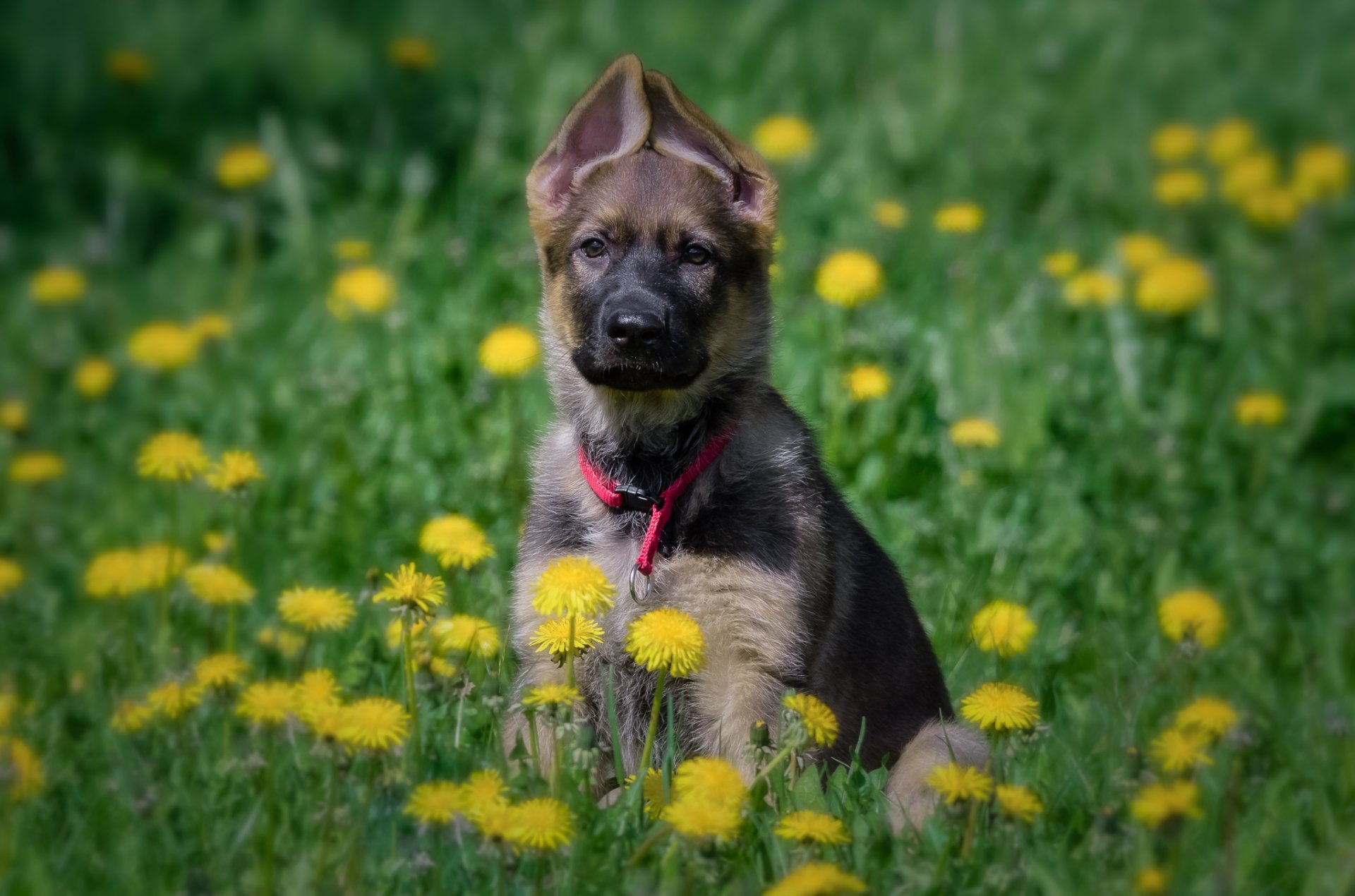 Deutscher Schäferhundwelpe sitzt mit erhobenen Ohren auf einer Wiese mit Löwenzahn