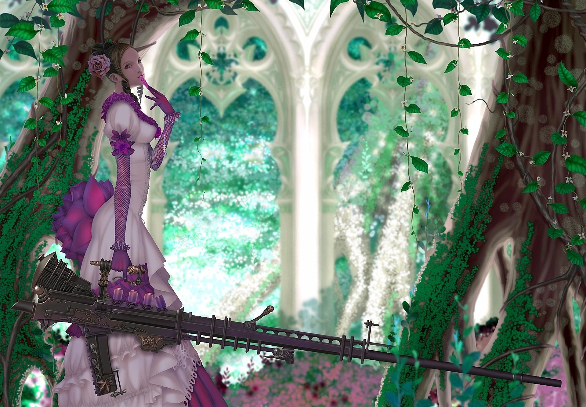 Magisches Mädchen mit Gewehr auf Bogenhintergrund