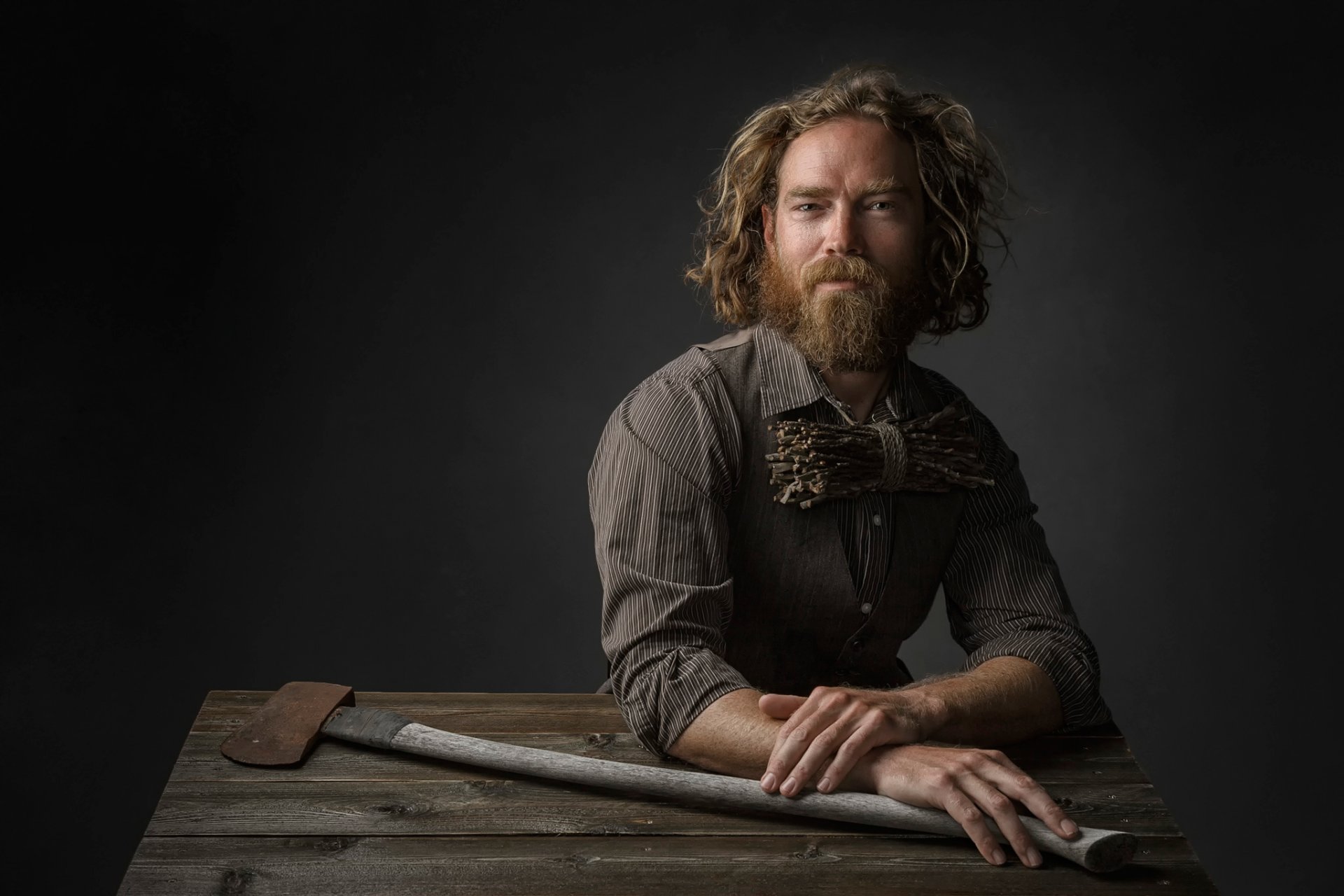 Ein bärtiger Mann sitzt am Tisch und isst zu Mittag