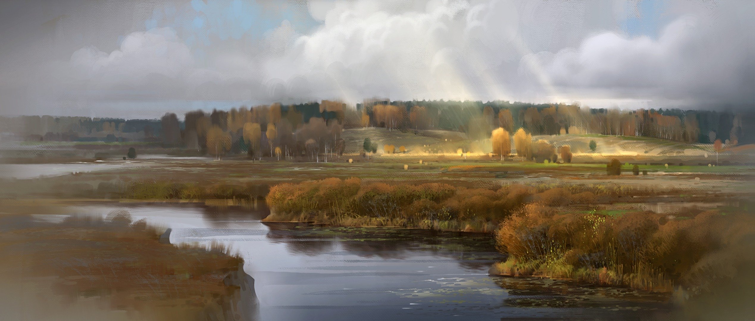 Die russische Landschaft. Feld, Fluss, Wald