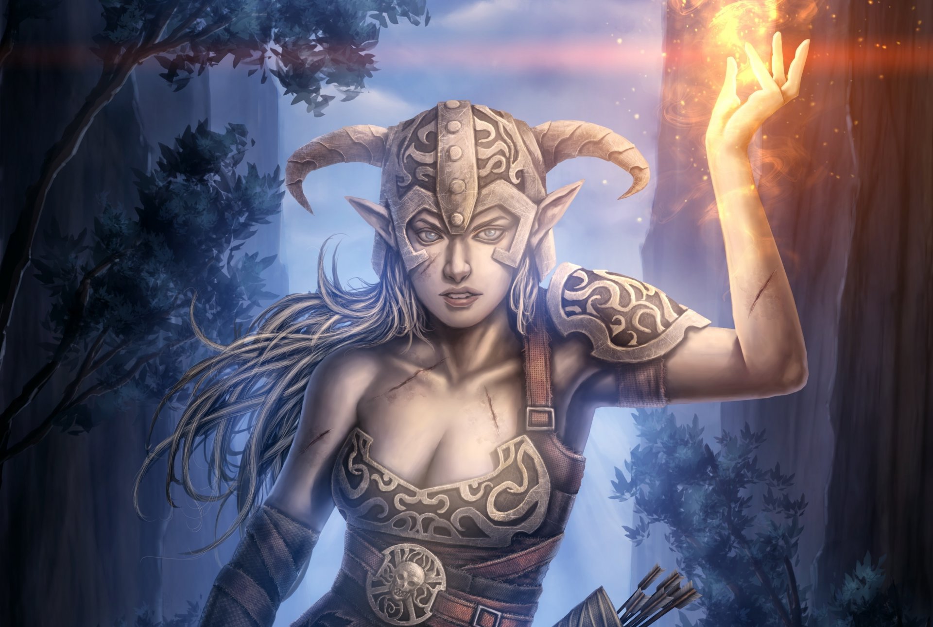 Zwischen den Bergen hält ein Mädchen mit einem Helm mit Hörnern ein Feuer in der Hand