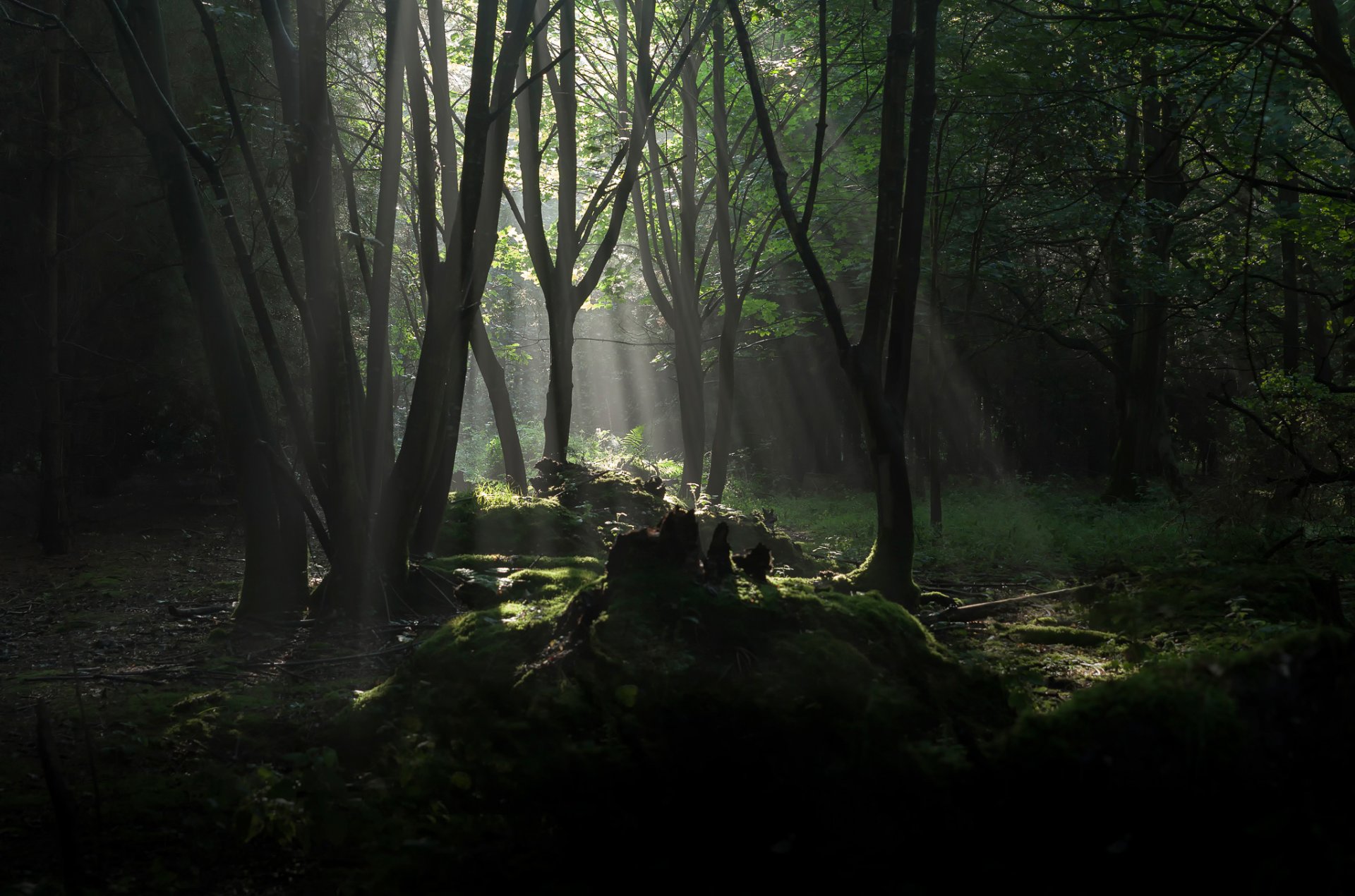 Der düstere Wald wird von den Sonnenstrahlen getroffen