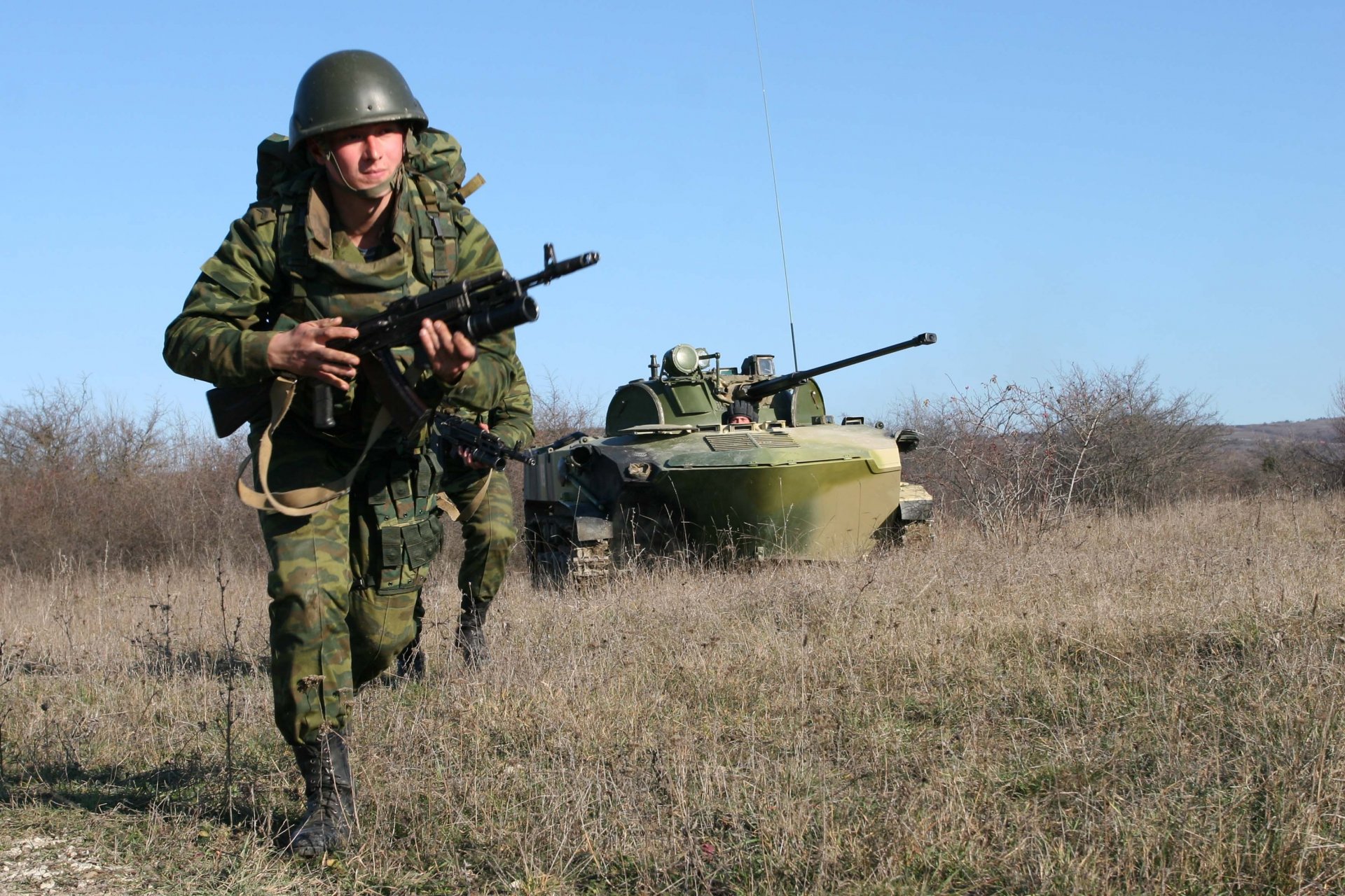 Militär läuft mit Maschinengewehr über das Feld