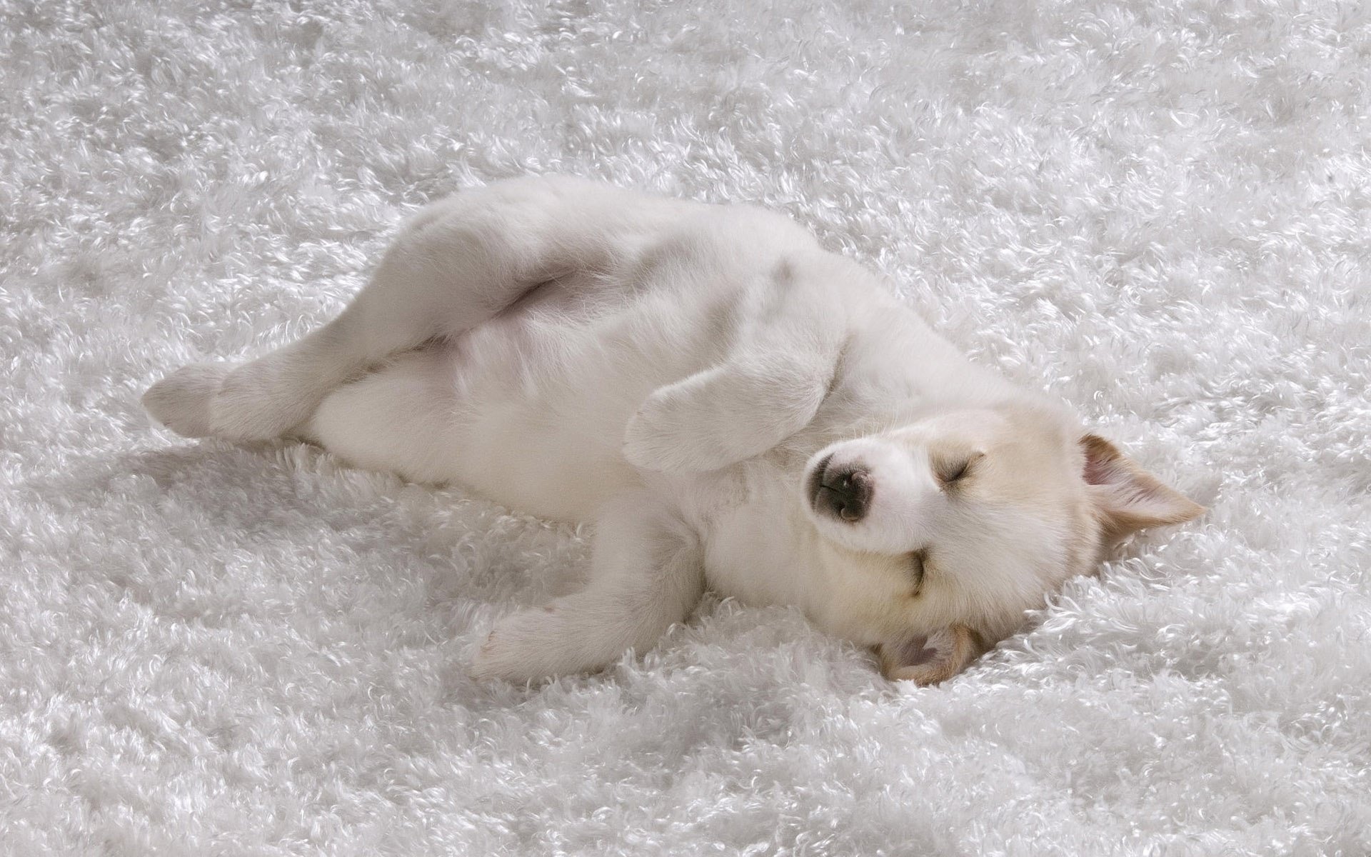 Auf einer schneeweißen Decke liegt süß ein schlafender Welpe mit weißem Fell