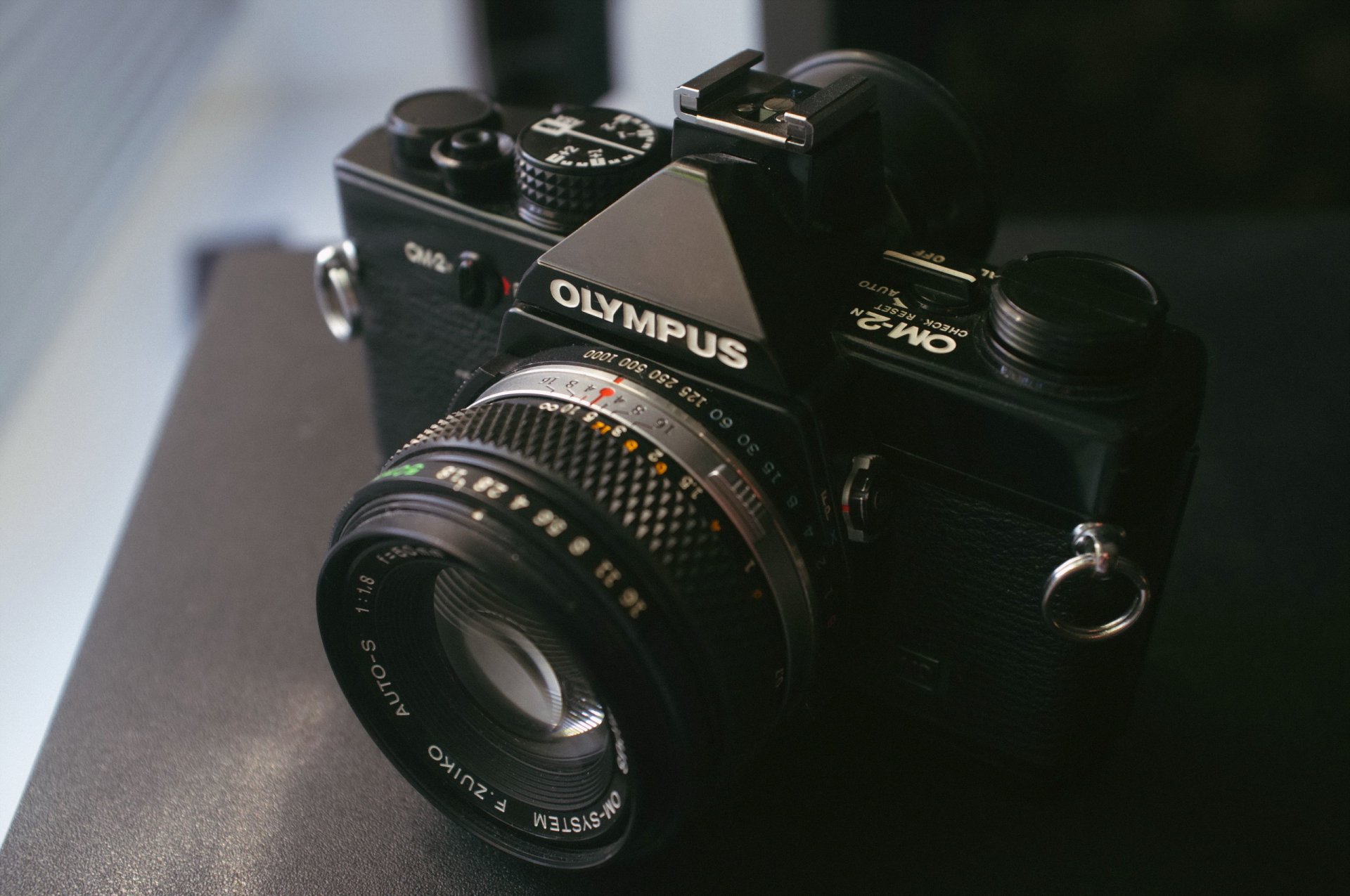 Makroaufnahme einer alten Kamera auf weißem Hintergrund