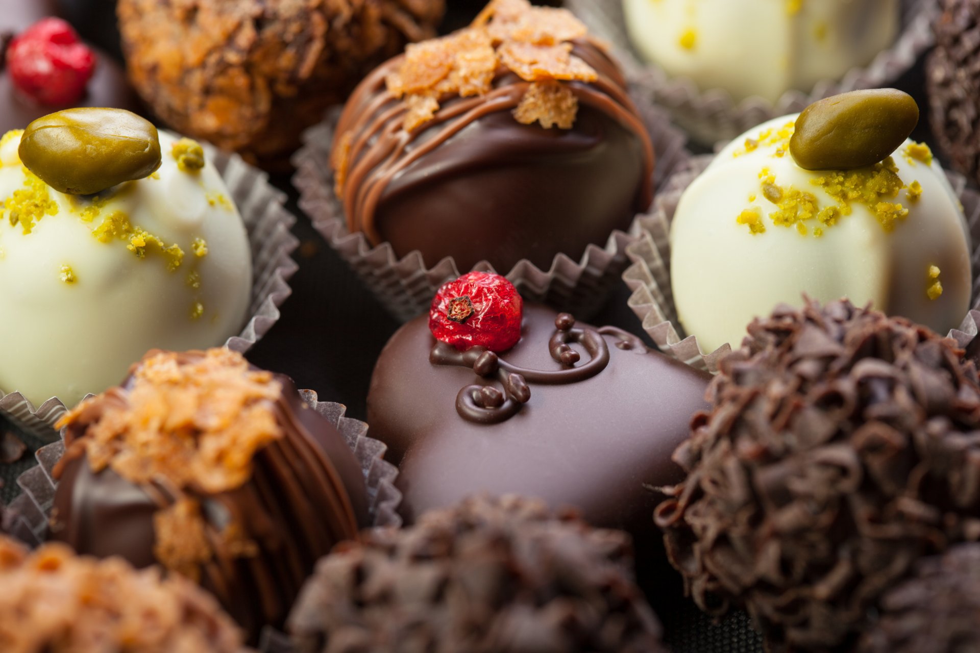 Dunkle Schokoladenbonbons sind mit Beeren und Pistazien verziert