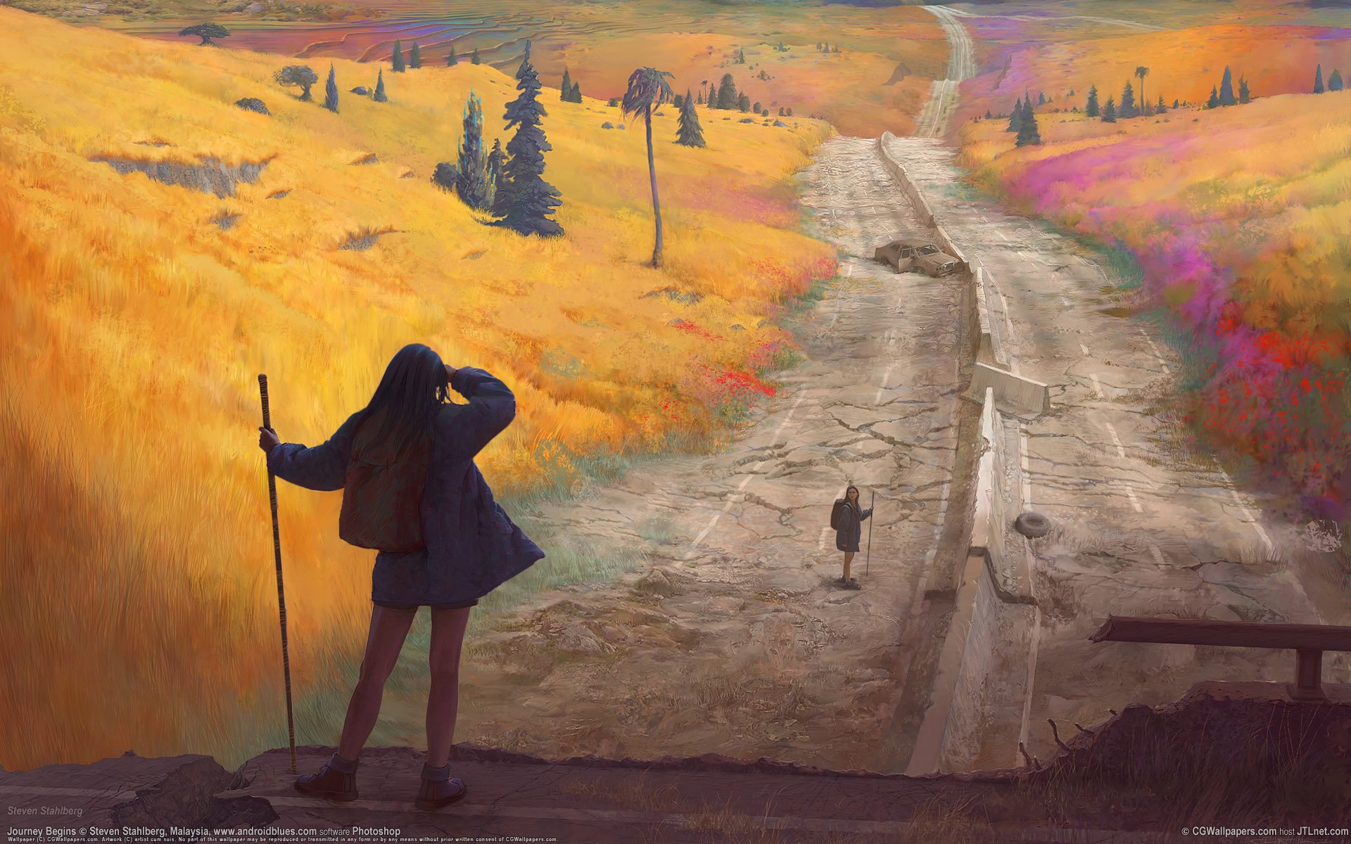 Mädchen in dunkler Kleidung auf einer großen postapokalyptischen Straße zeichnen