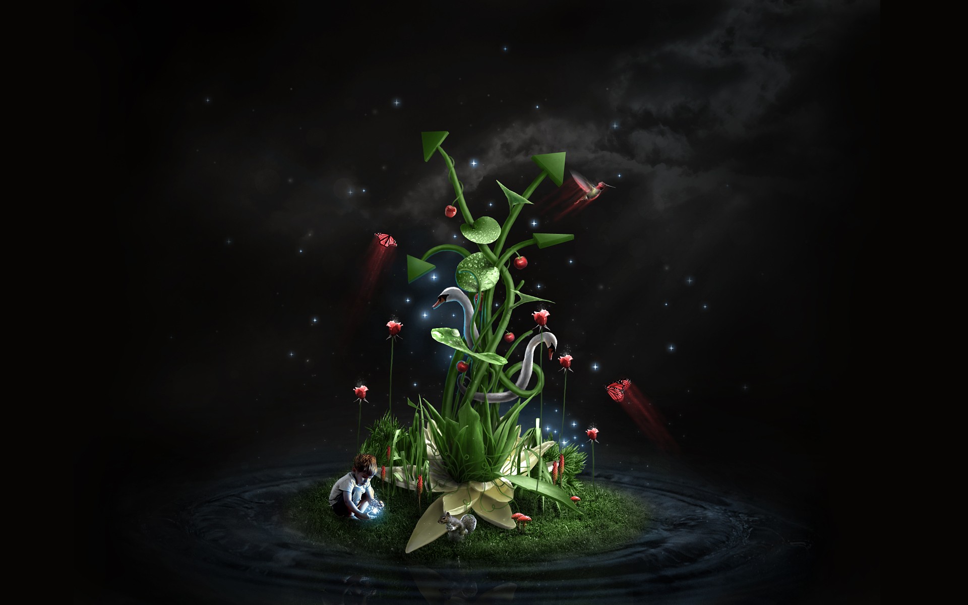 Baby bei Blumen mit Glühwürmchen, Schmetterlingen, Schwan und Eichhörnchen