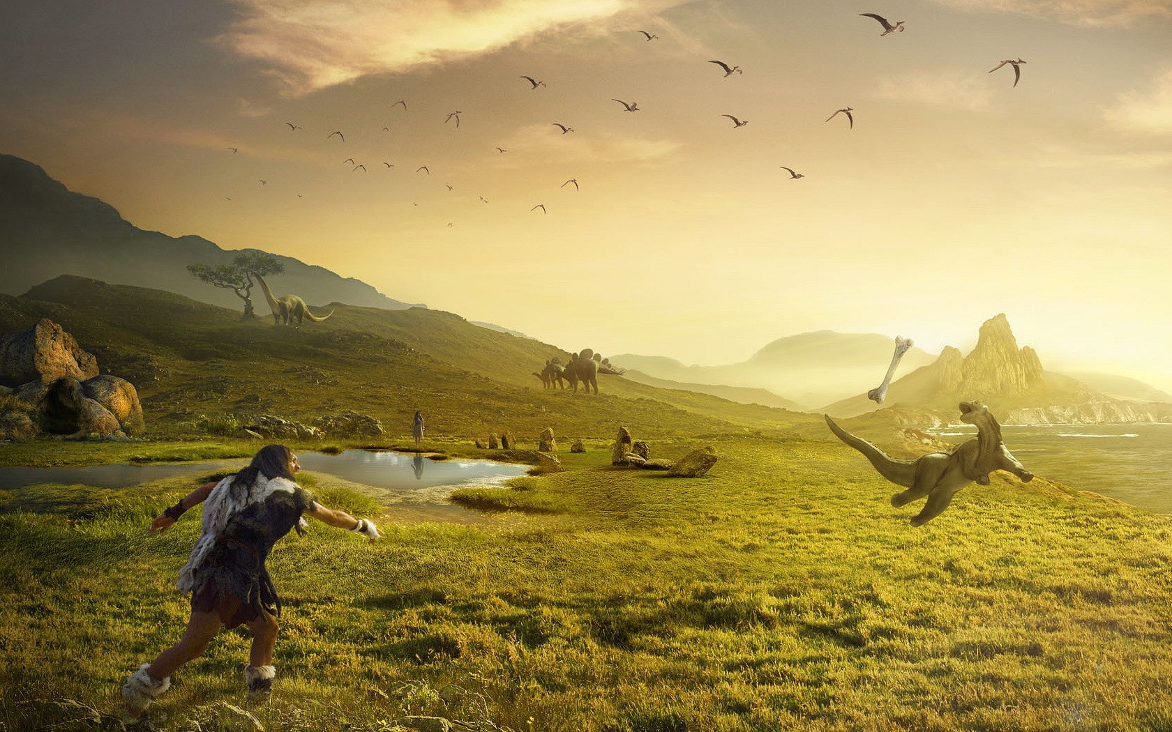 Ein primitiver Mensch wirft seinem Dinosaurier einen Knochen zu