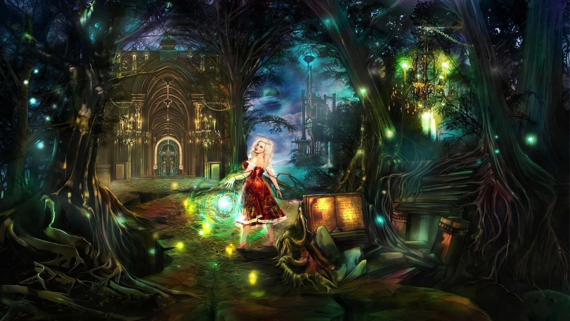 Ein fantastisches Schloss in einer Höhe, mit Bergen am Horizont