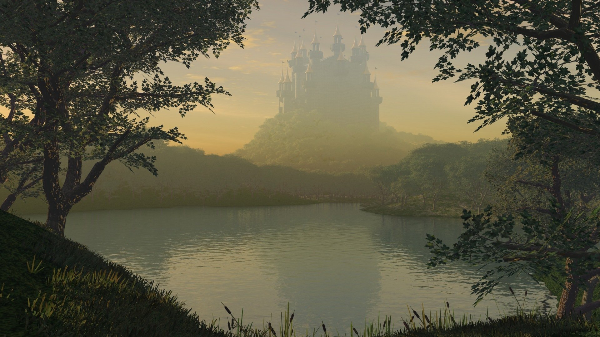 Landschaft und Menschen und Schloss Sonnenaufgang und Steine
