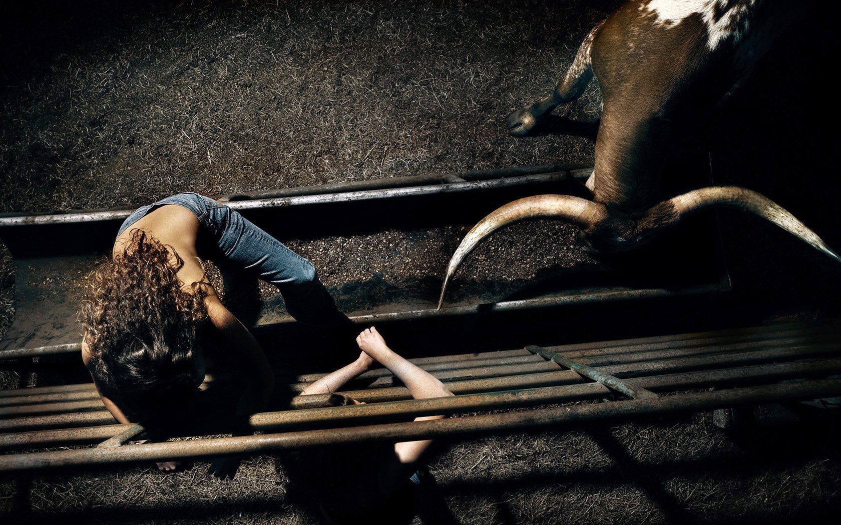 Ein Stier hat ein Mädchen in der Arena mit den Hörnern getrieben
