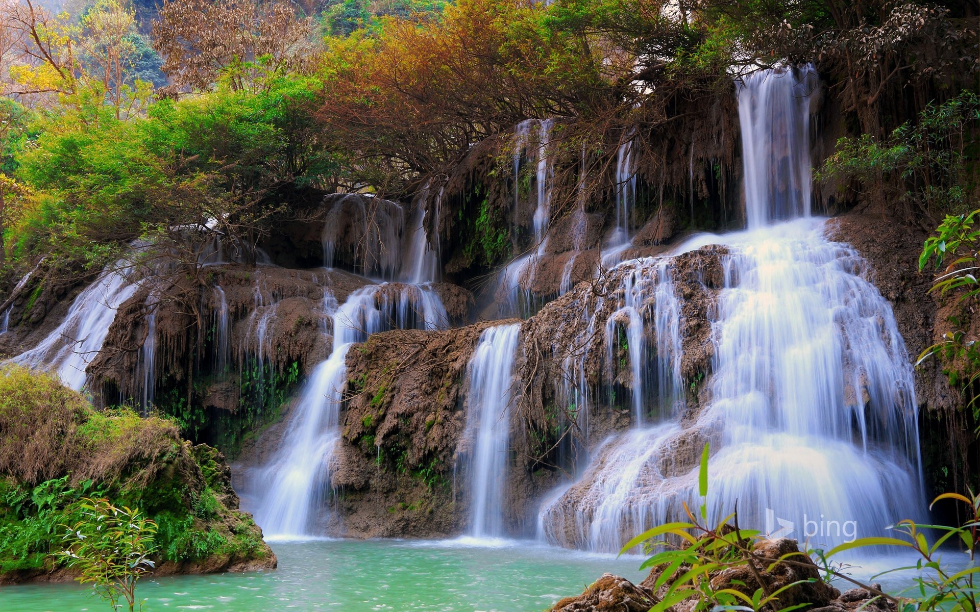 Schöne Wasserfälle sind von Wald umgeben