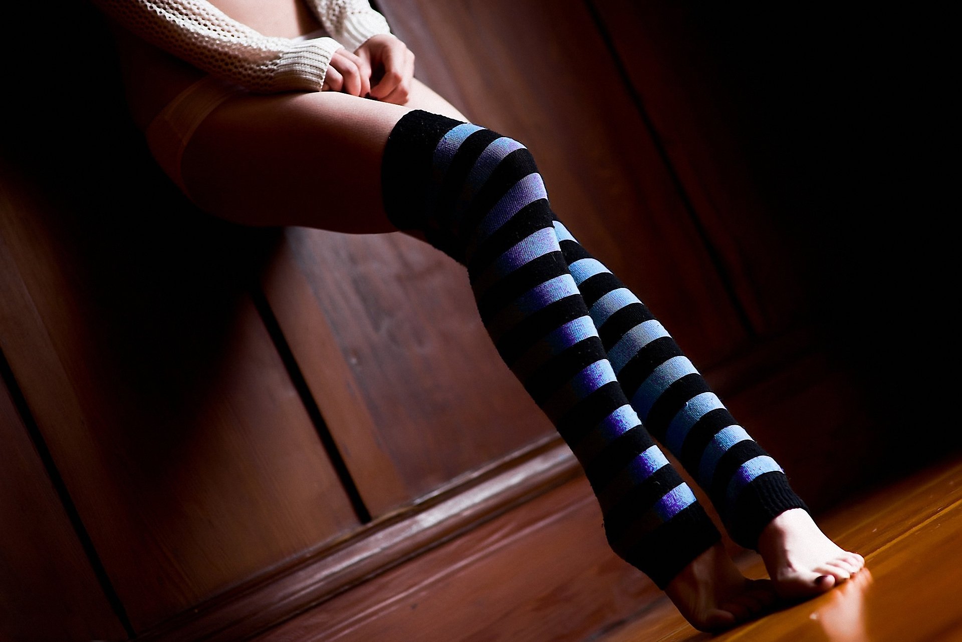 Mädchen in gestrickten gestreiften Strümpfen lehnte sich an die Wand