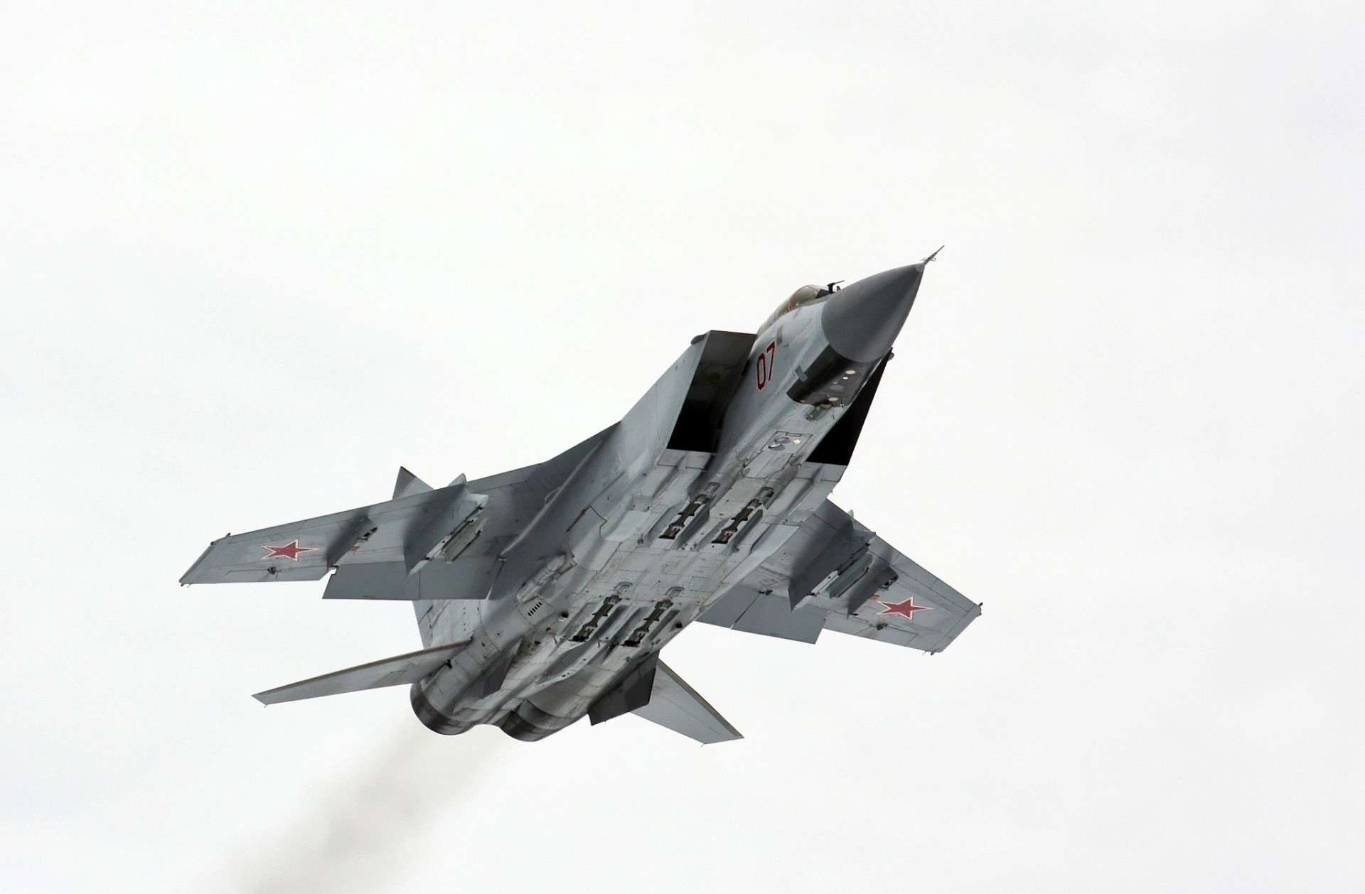 Sowjetischer Kampfjet über Feld mit Panzern