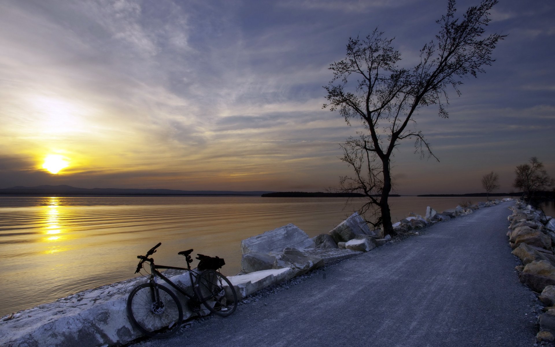 Gelbes Motorrad am Flussufer
