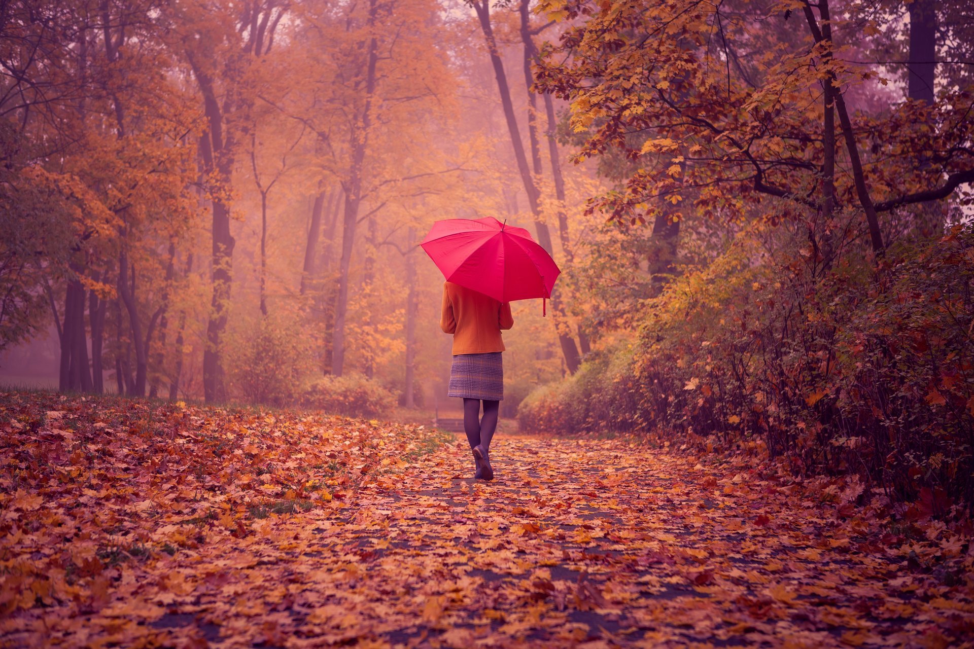 Mädchen mit einem roten Regenschirm im Herbstpark