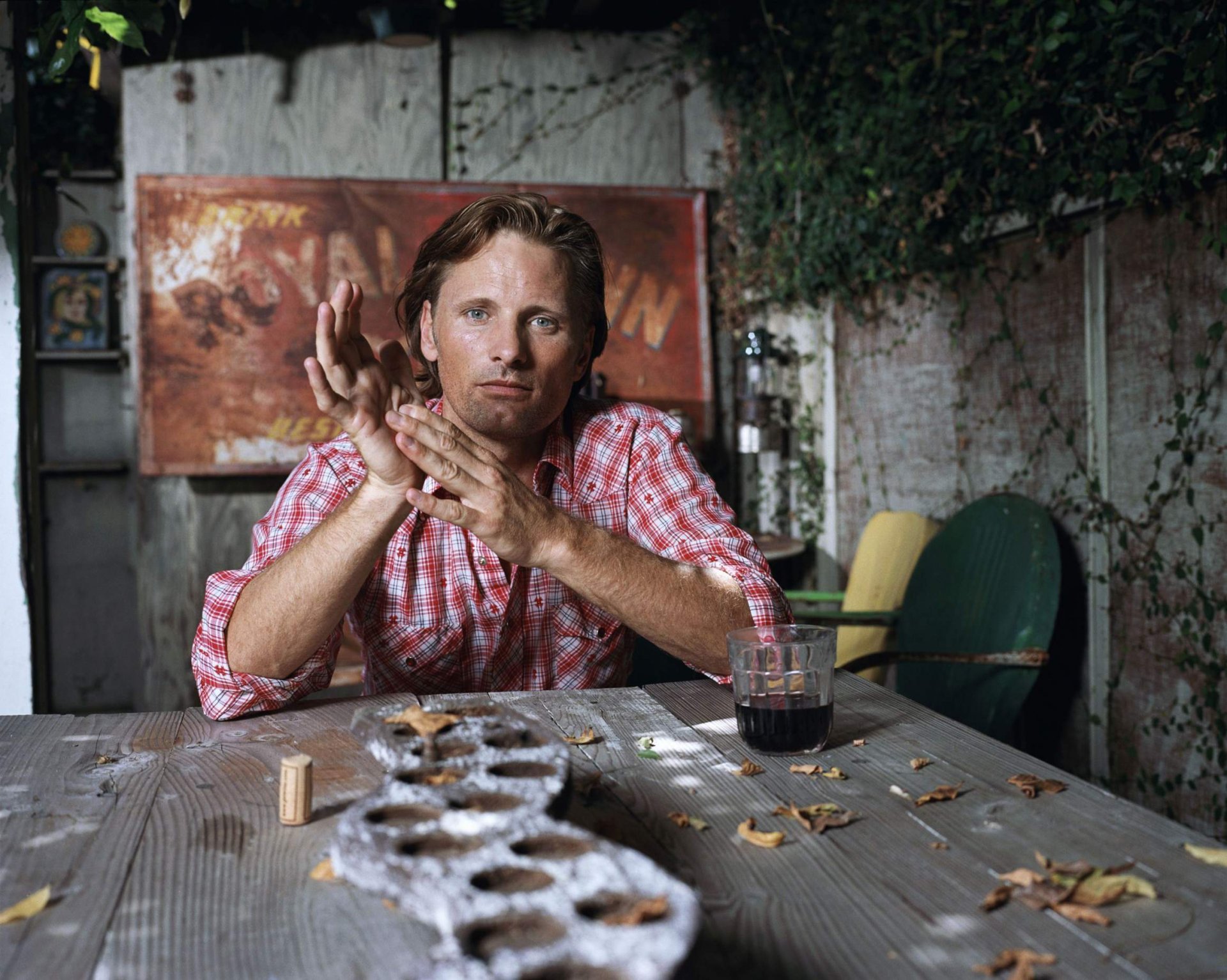 Mann mit Cowboyhut und aufgeknöpftem Hemd