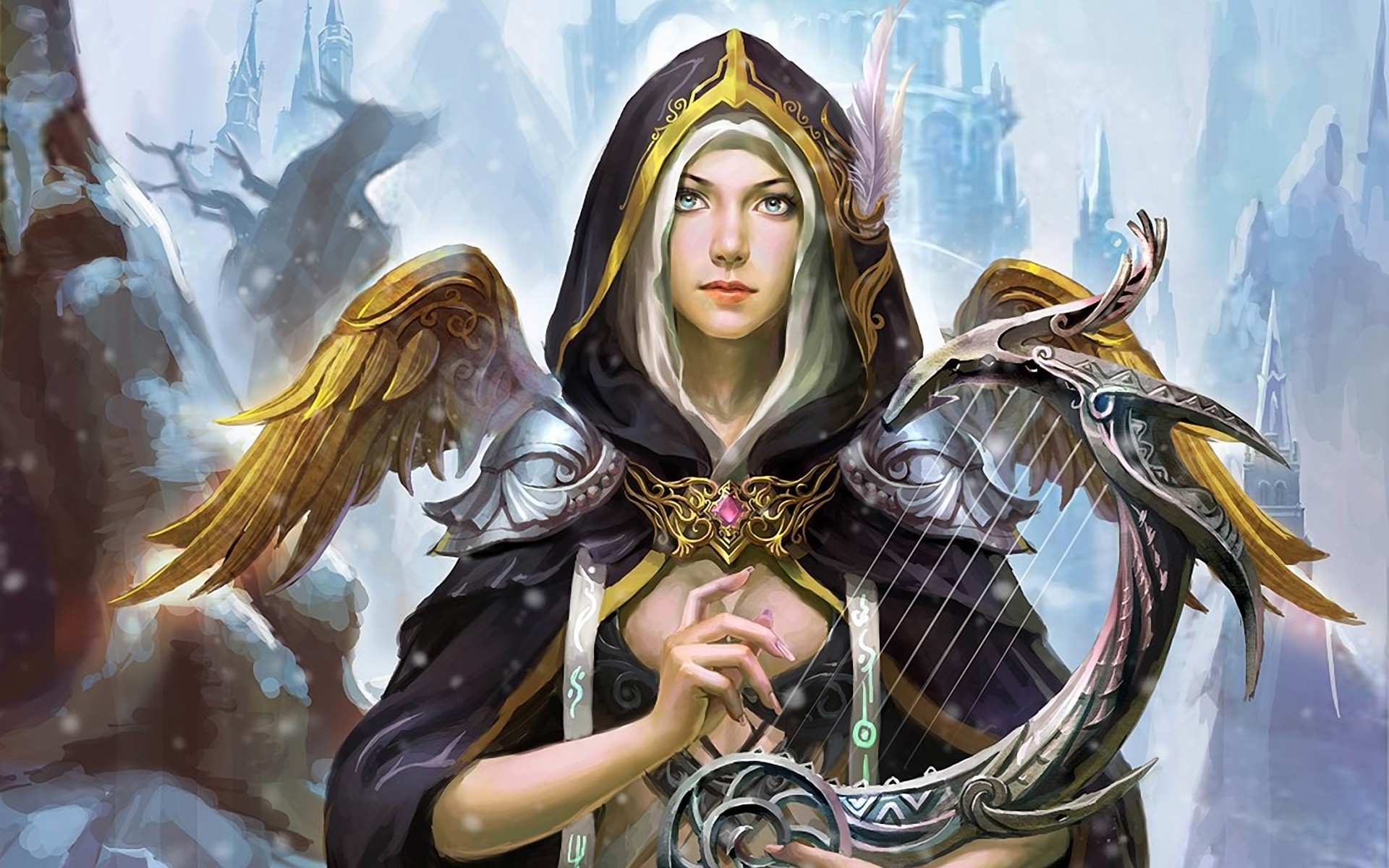 Ein Mädchen mit Federn spielt eine Saitenharfe