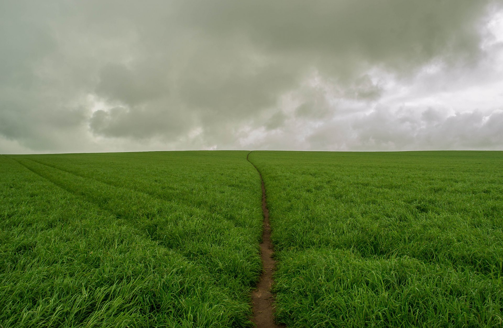 Grünes Feld vor dem Hintergrund eines bewölkten, finsteren Himmels