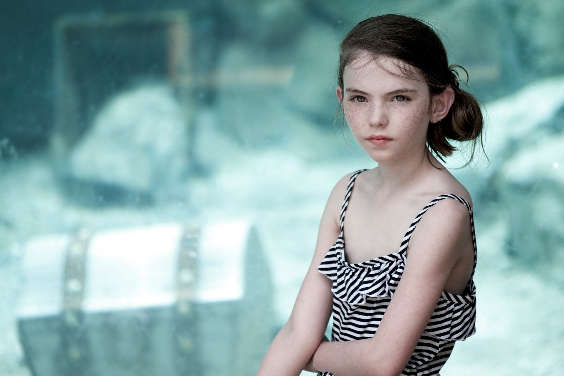 Kleines Mädchen auf einem Hintergrund mit einem nautischen Thema