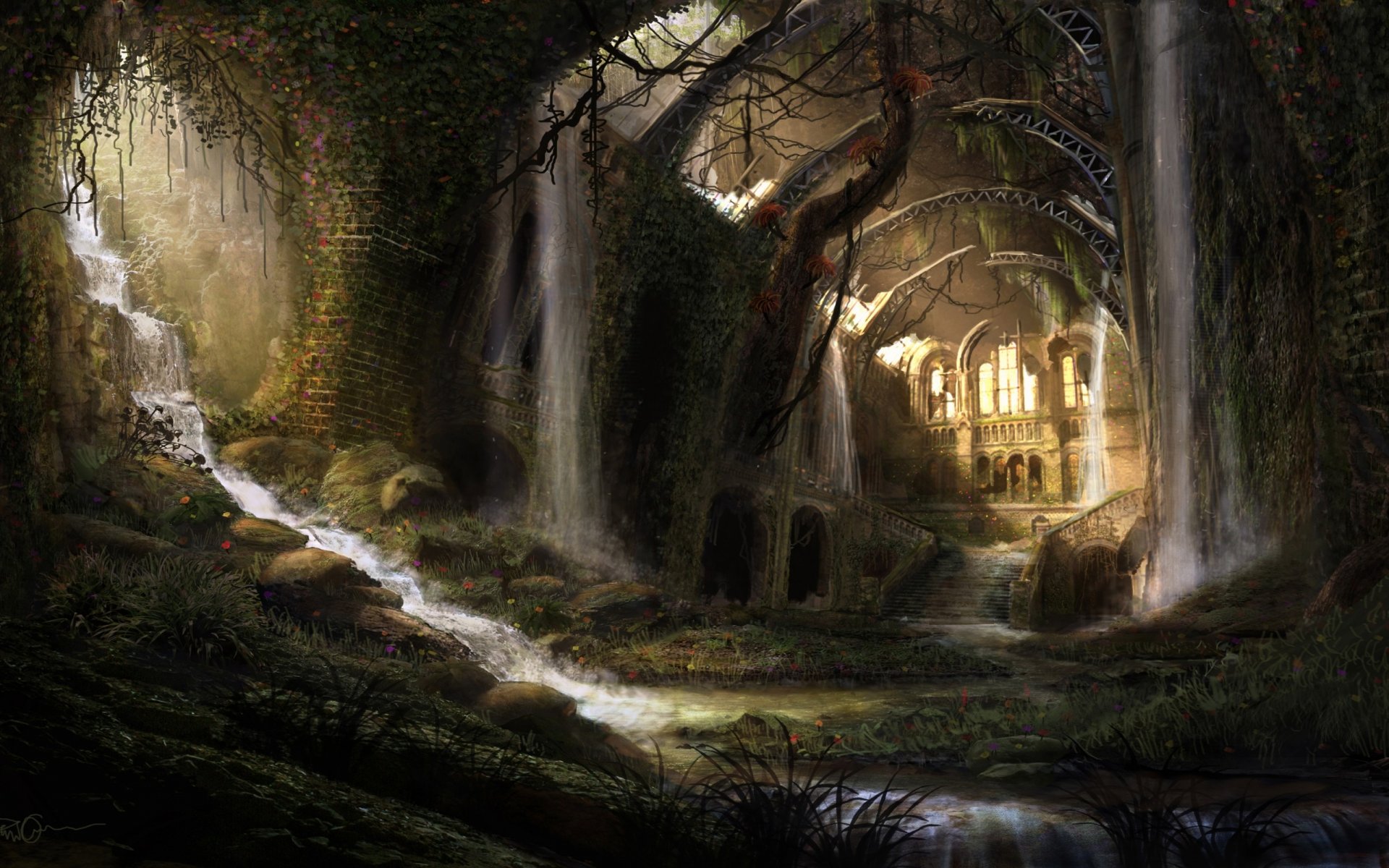 Dickicht aus Bäumen. Wasserfall in der Höhle