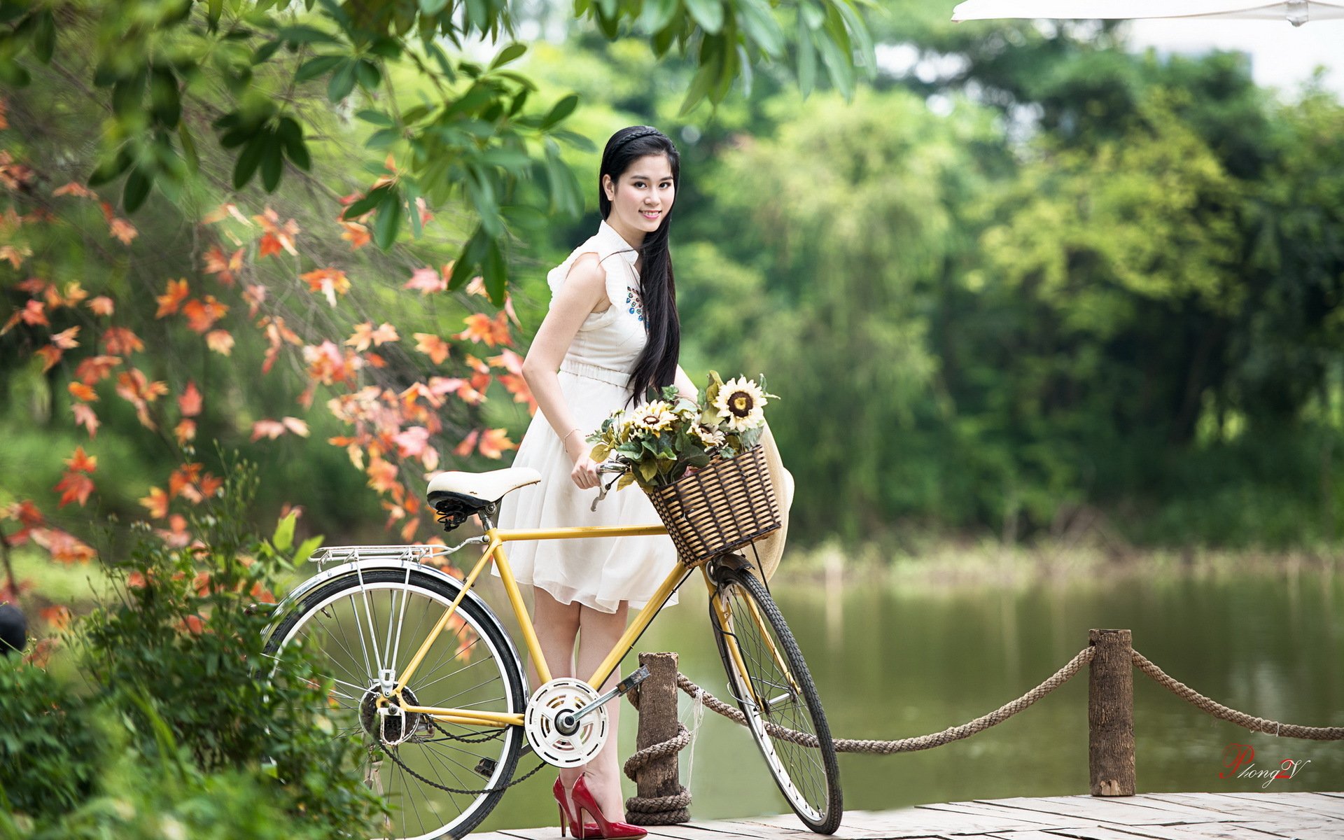 Asiatische Frau im weißen schwimmen auf einem Fahrrad