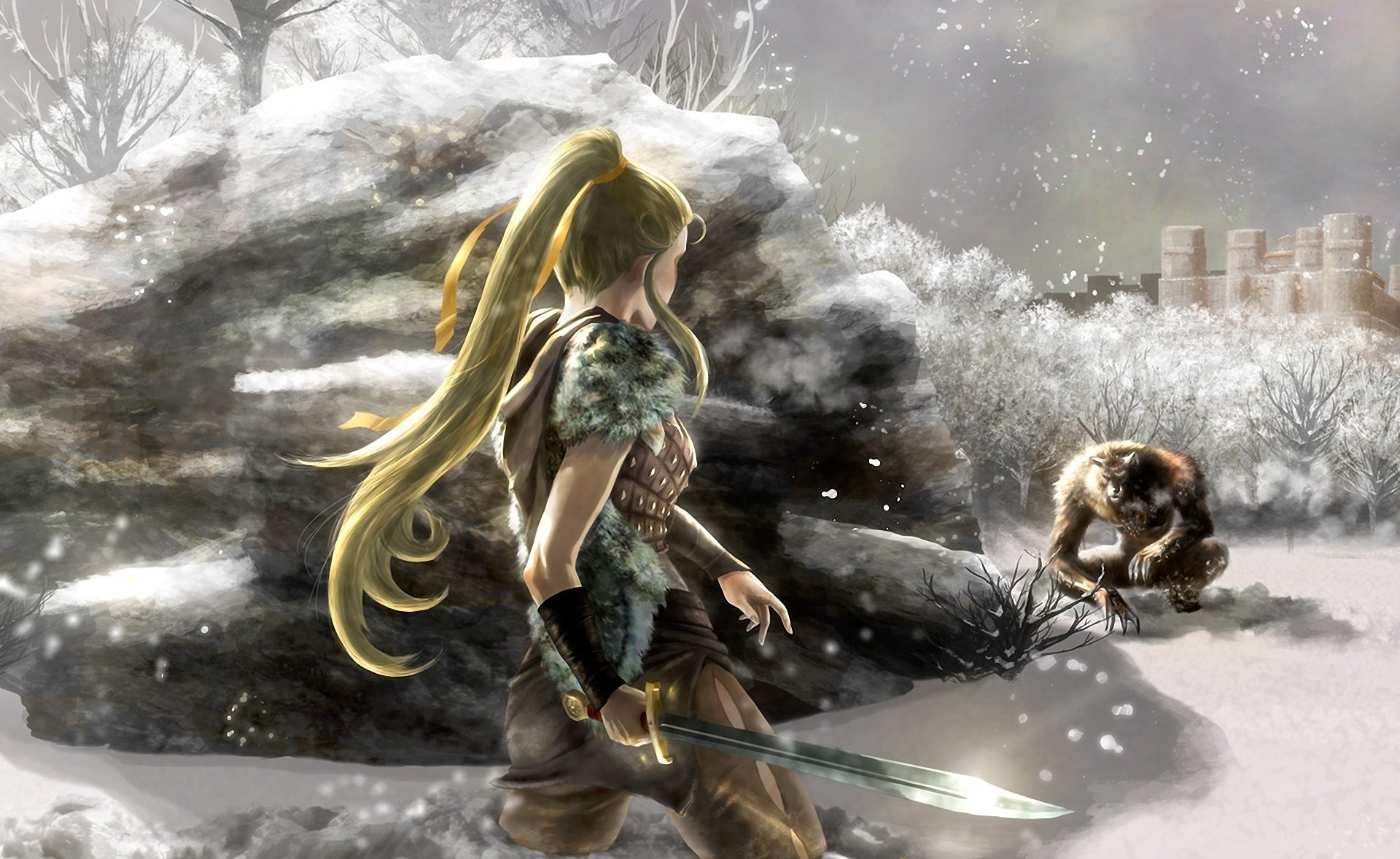Zeichnung eines Kriegers, der gegen einen Feuerdämon kämpft