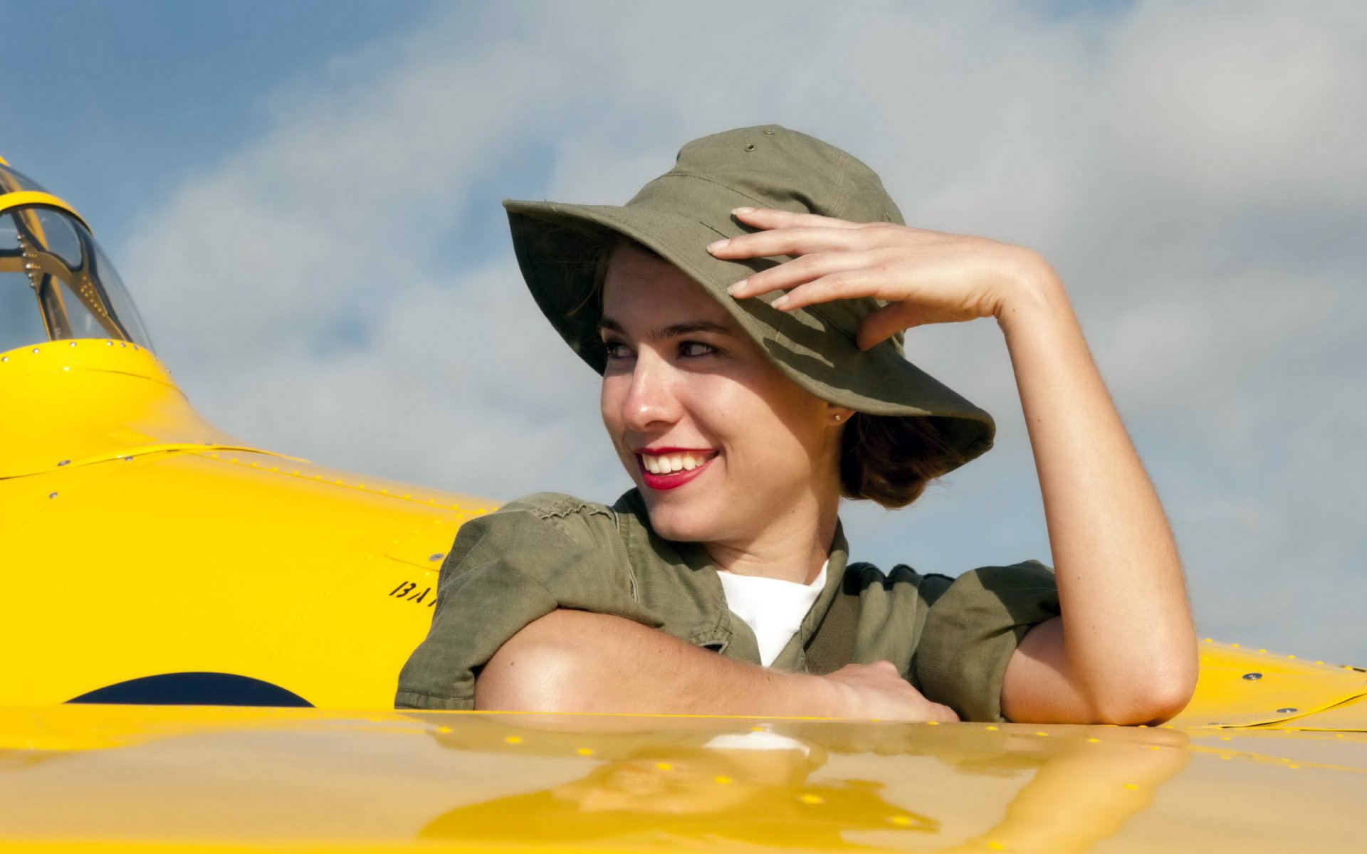 Brünette von hinten im roten T-Shirt mit einer Hand, die in bunten Figuren auf blauem Hintergrund über den Kopf geworfen wird