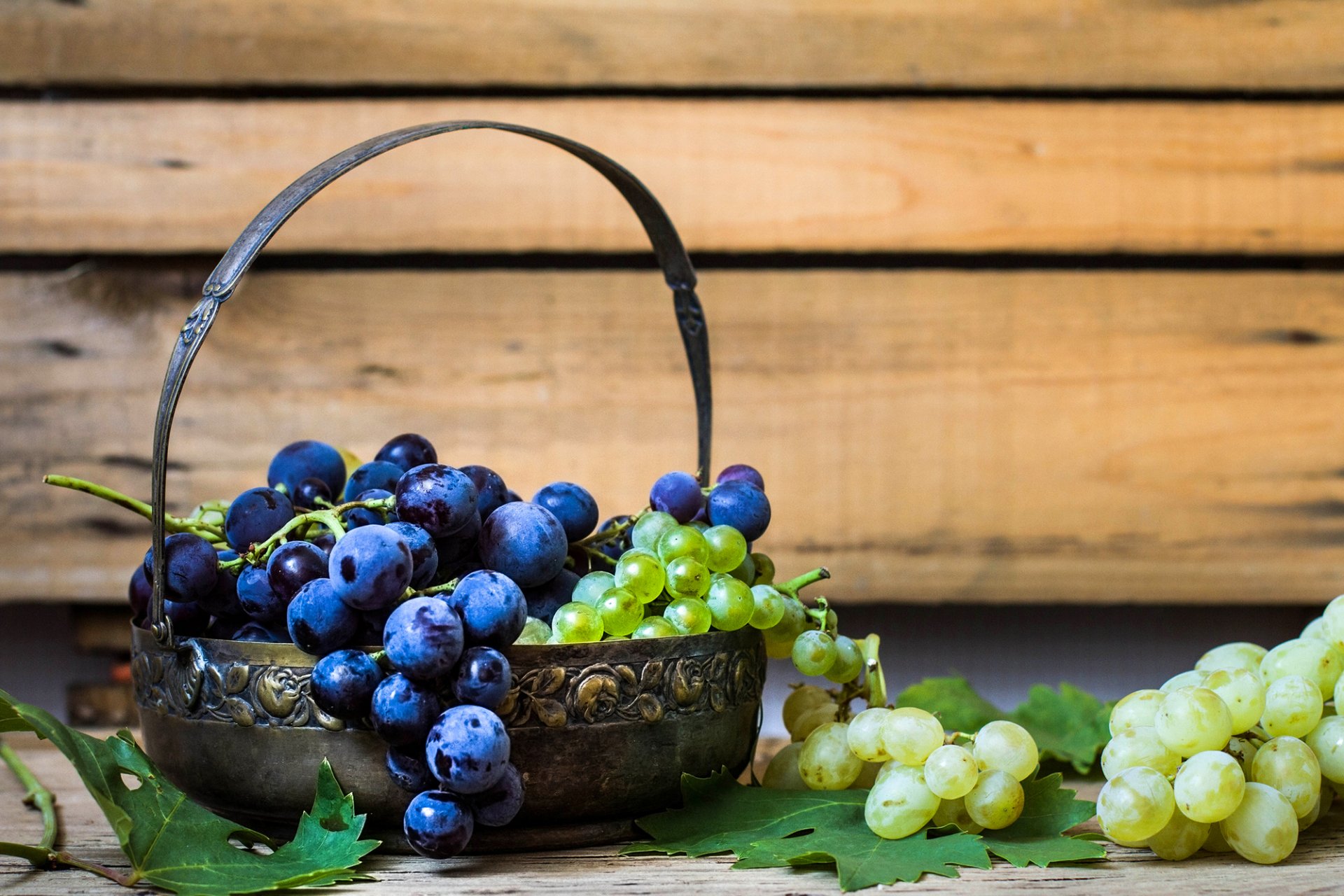 Trauben weißer und roter Trauben auf dem Tisch und im Korb