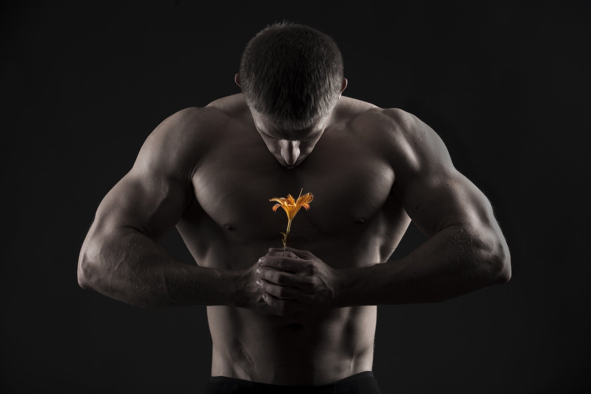 Männlicher afroamerikanischer Athlet mit orangefarbener Blume
