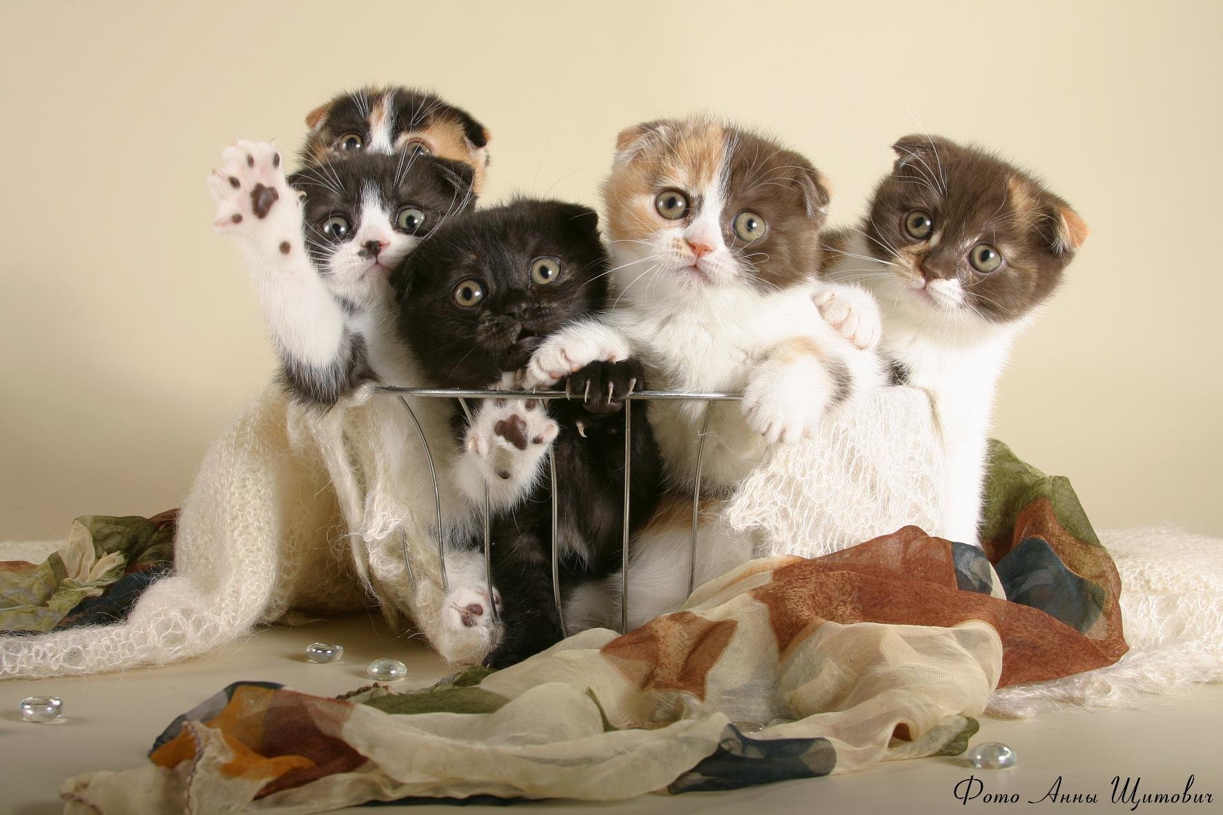 Bunte Kätzchen in einem Korb mit Kopftuch