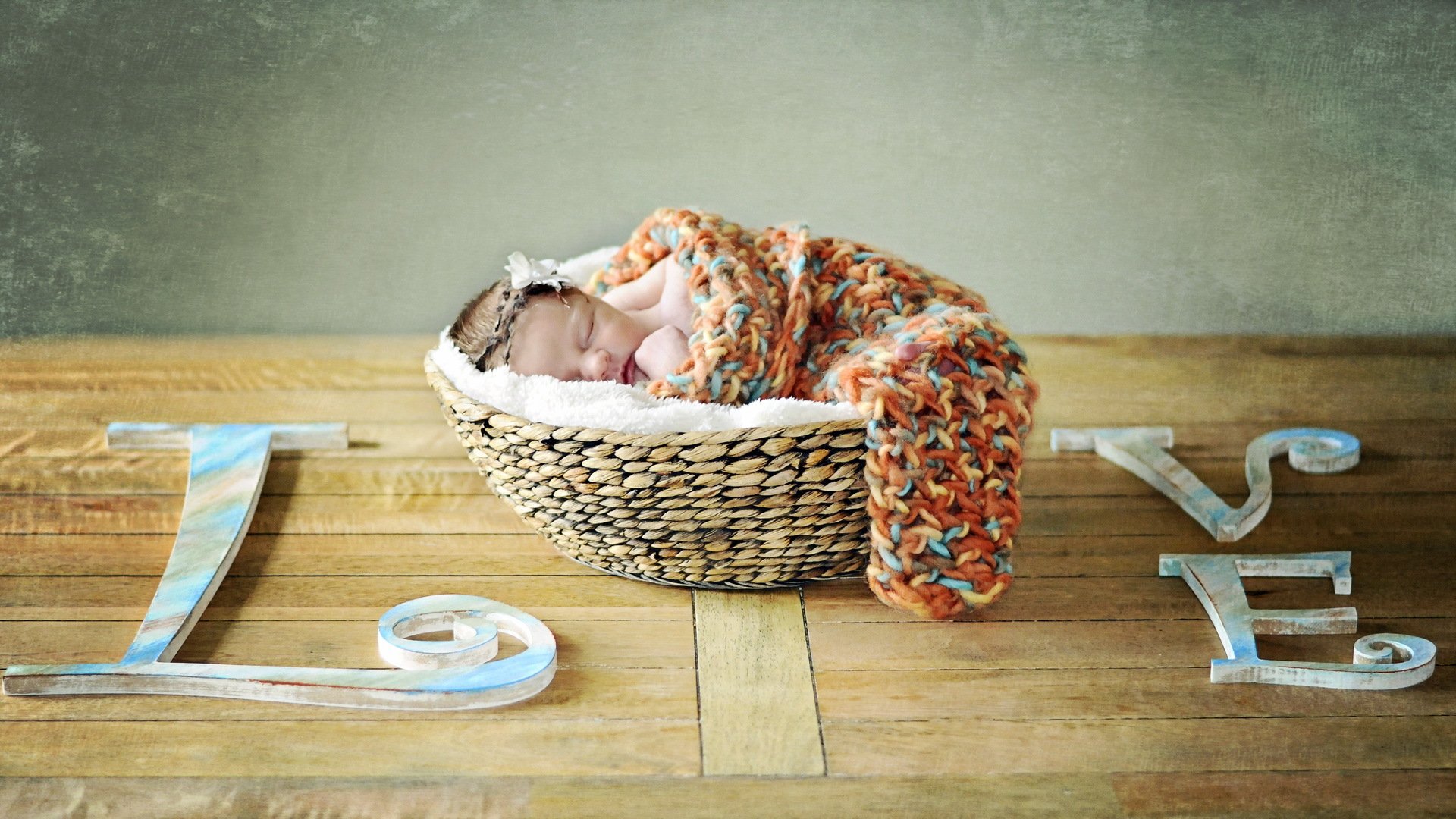 Ein Kleinkind mit einer weißen Mütze ist in ein gelbes Handtuch gewickelt