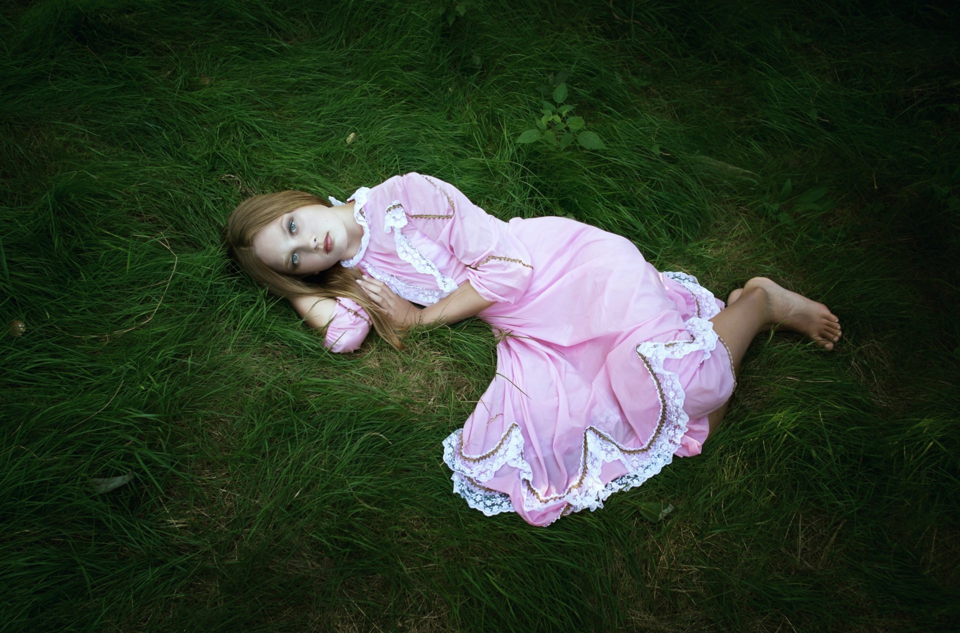 Das Mädchen im schwarzen Kleid liegt mit den Füßen nach oben