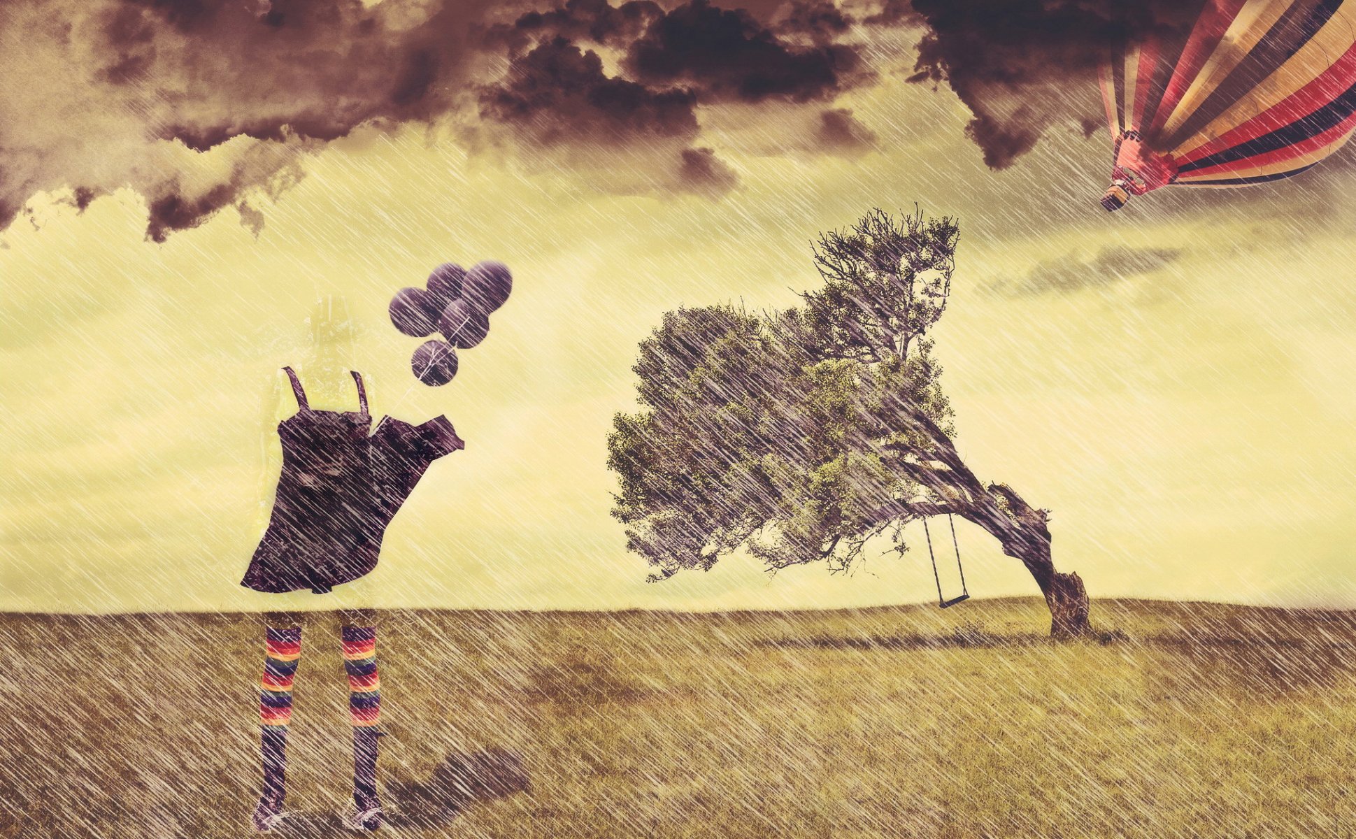 Eine unsichtbare Figur steht neben einem Baum mit einer Schaukel
