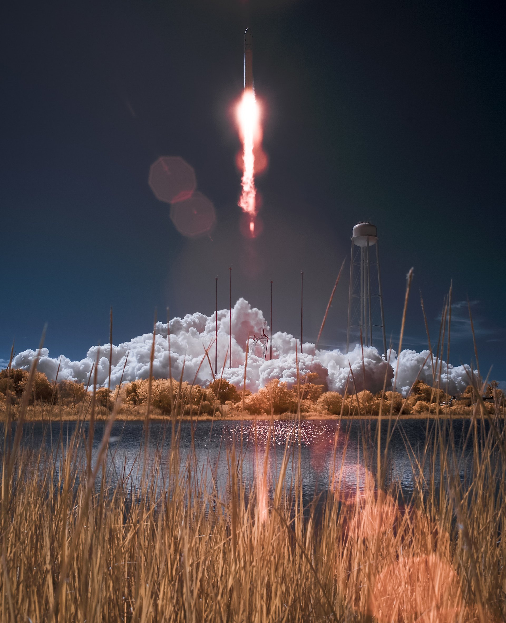Raketenstart vor dem Hintergrund des Sees und der Ähren