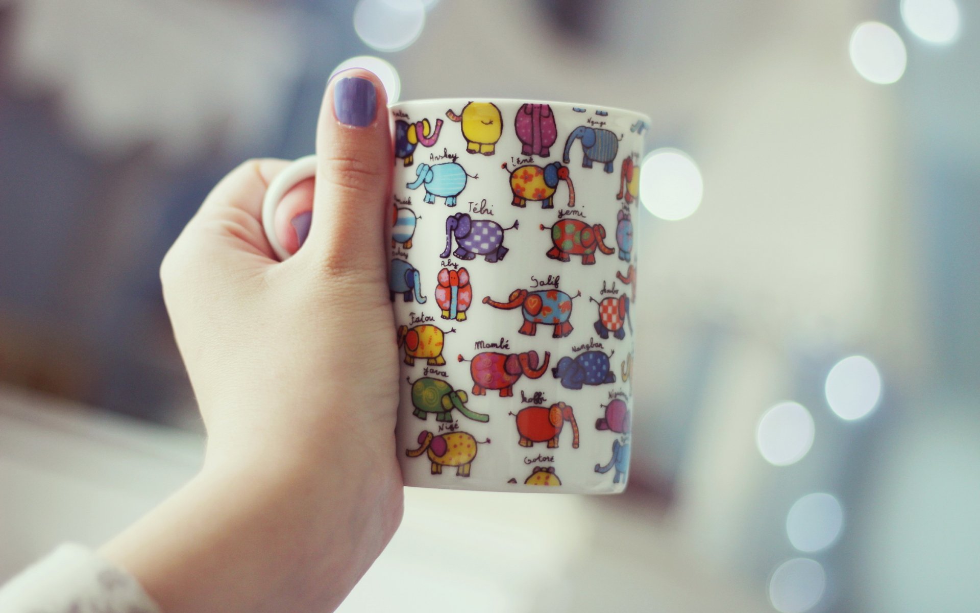 Das Mädchen hält einen Becher mit Elefanten in der linken Hand