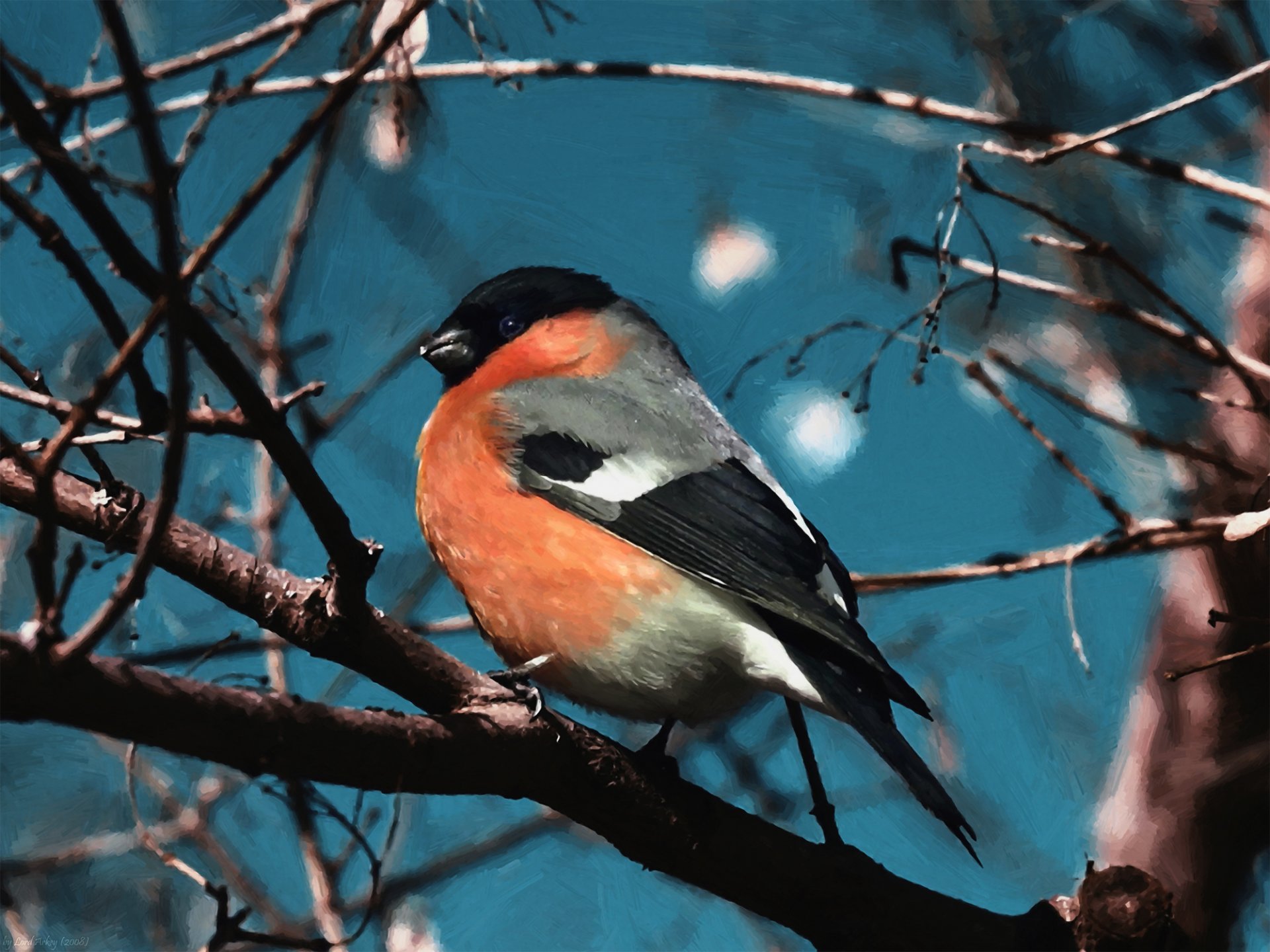 Gimpel mit einer hellen roten Brust auf schneebedeckten Zweigen