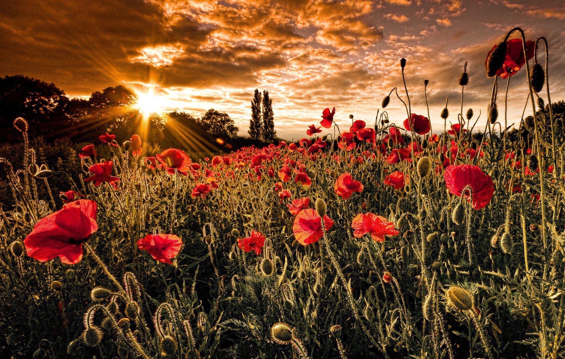 Schöner Sonnenuntergang über einem Feld mit Mohnblumen