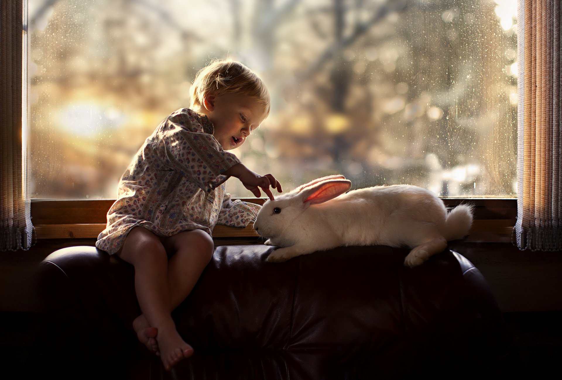 Kind spielt mit einem weißen Kaninchen am Fenster