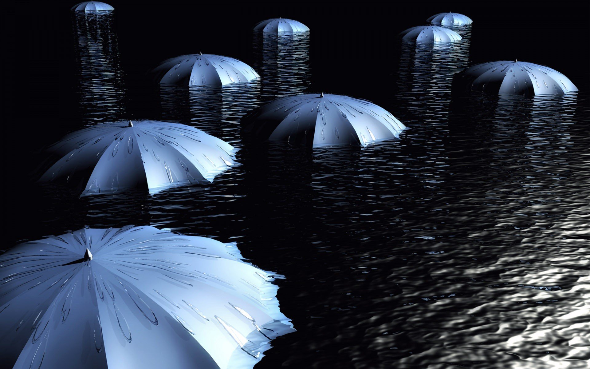 Einfarbige graue Regenschirme auf schwarzem Wasser