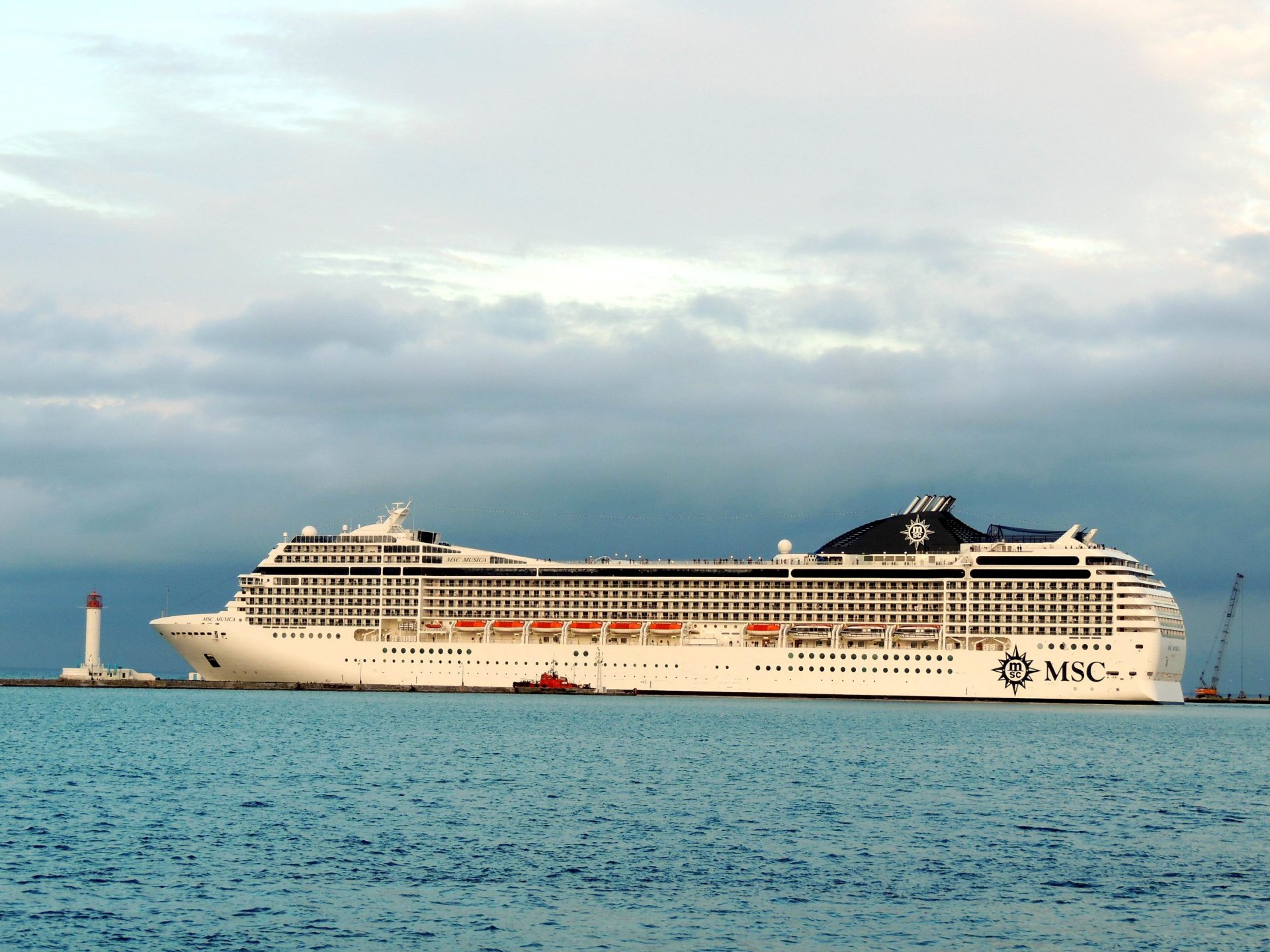 Kreuzfahrtschiff im Wasser vor dem Hintergrund eines Leuchtturms