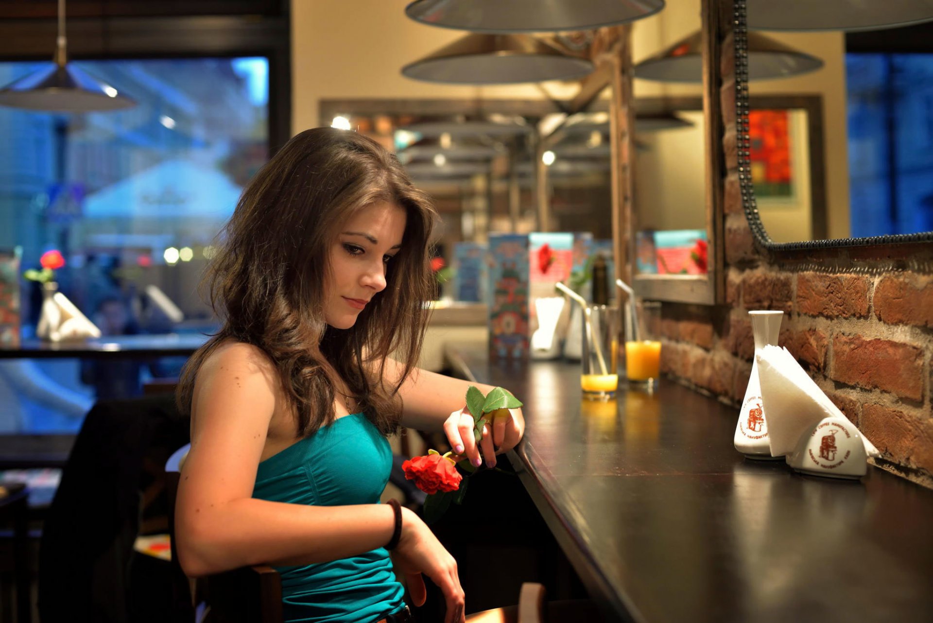Mädchen sitzt in einer bar mit einer Rose in der Hand