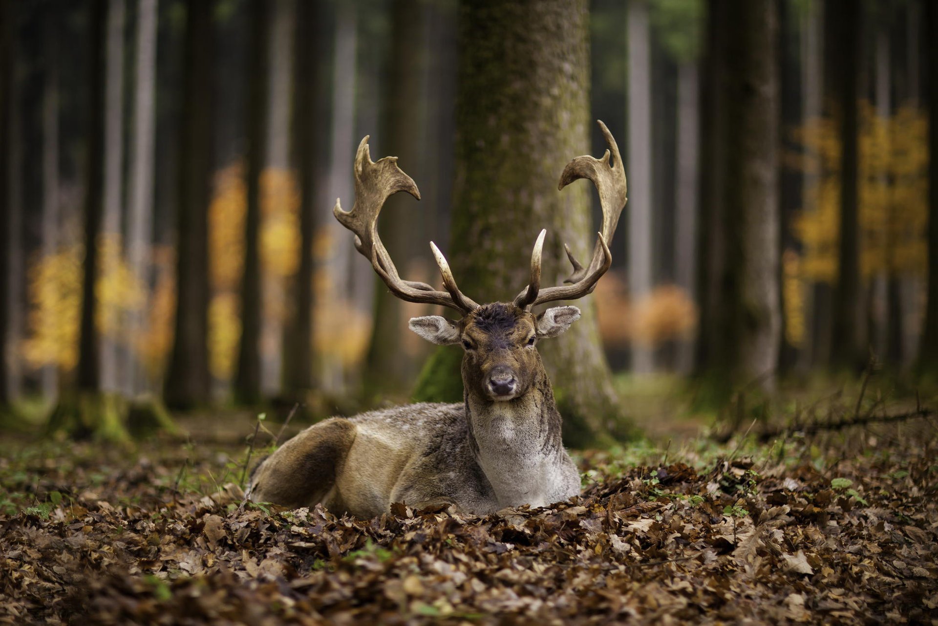 Ein Hirsch hat sich auf den Herbstblättern ausgebreitet