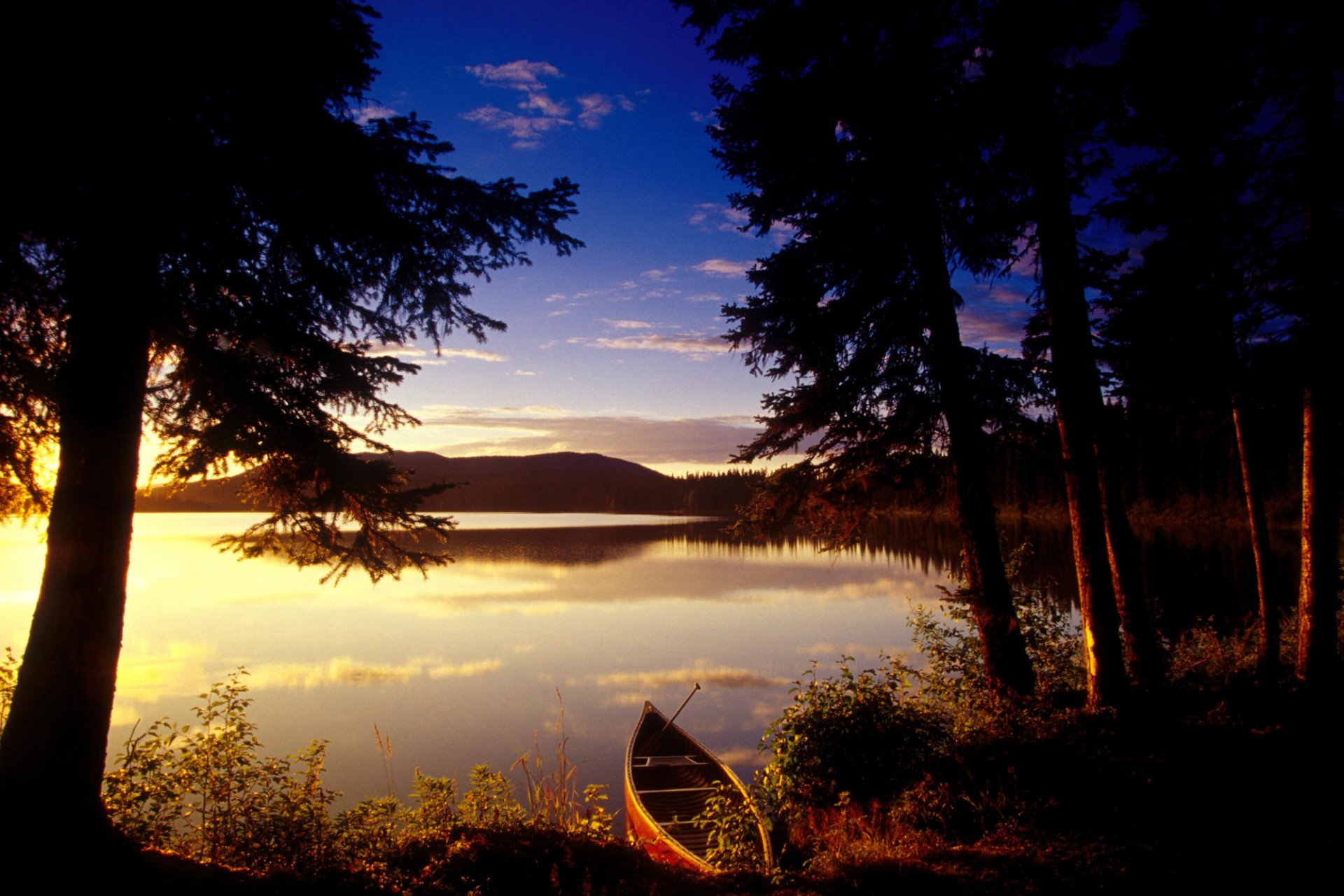 Boot am See in Bäumen und einem schönen Sonnenuntergang