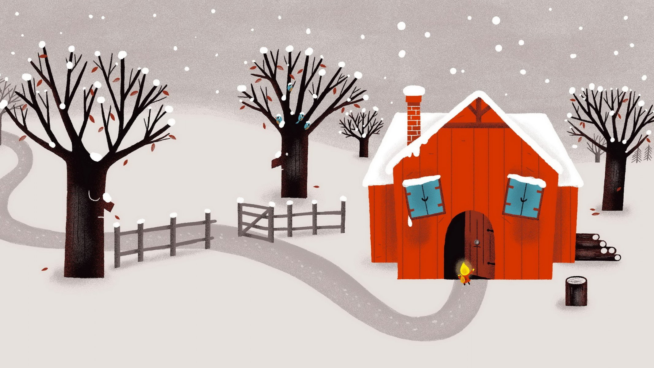 Rotes Haus und Bäume im Winter