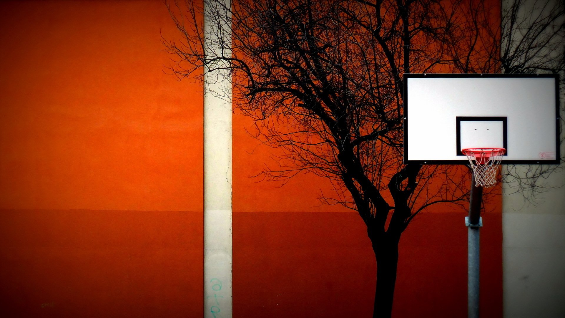 Helles Foto Sportschild. Basketball-Schild auf hellem Hintergrund. Trockener Baum Schatten
